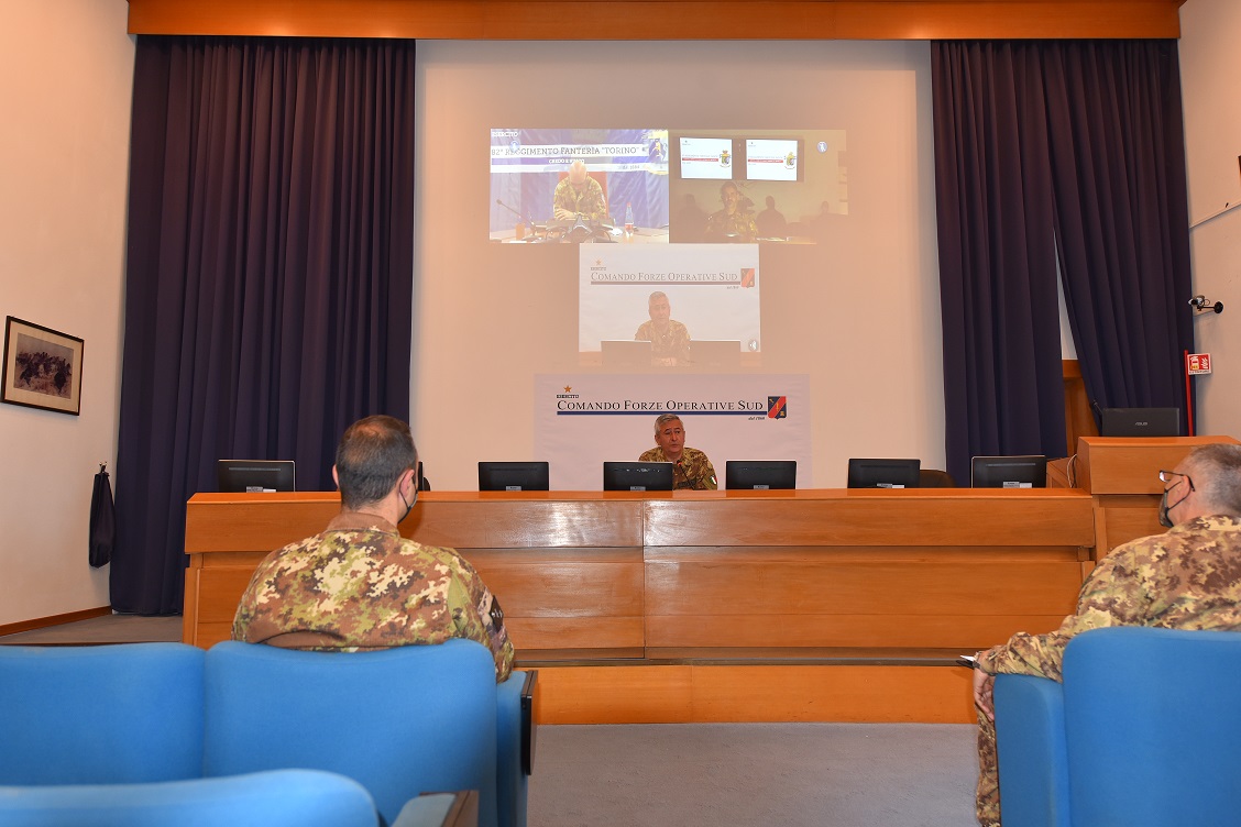 Passaggio di consegne al Comando del Raggruppamento “Calabria” nell’ambito dell’operazione “Strade Sicure” tra il 5° Reggimento Fanteria “Aosta” e l’82° Reggimento Fanteria “Torino”. Nel corso di un back brief in modalità videoteleconferenza al quale ha partecipato il Comandante delle Forze Operative Sud, Generale di Corpo d’Armata Giuseppenicola Tota, il Colonnello Tinelli Comandante cedente ha illustrato il bilancio dei sei mesi di attività operative condotte sul suolo calabrese.