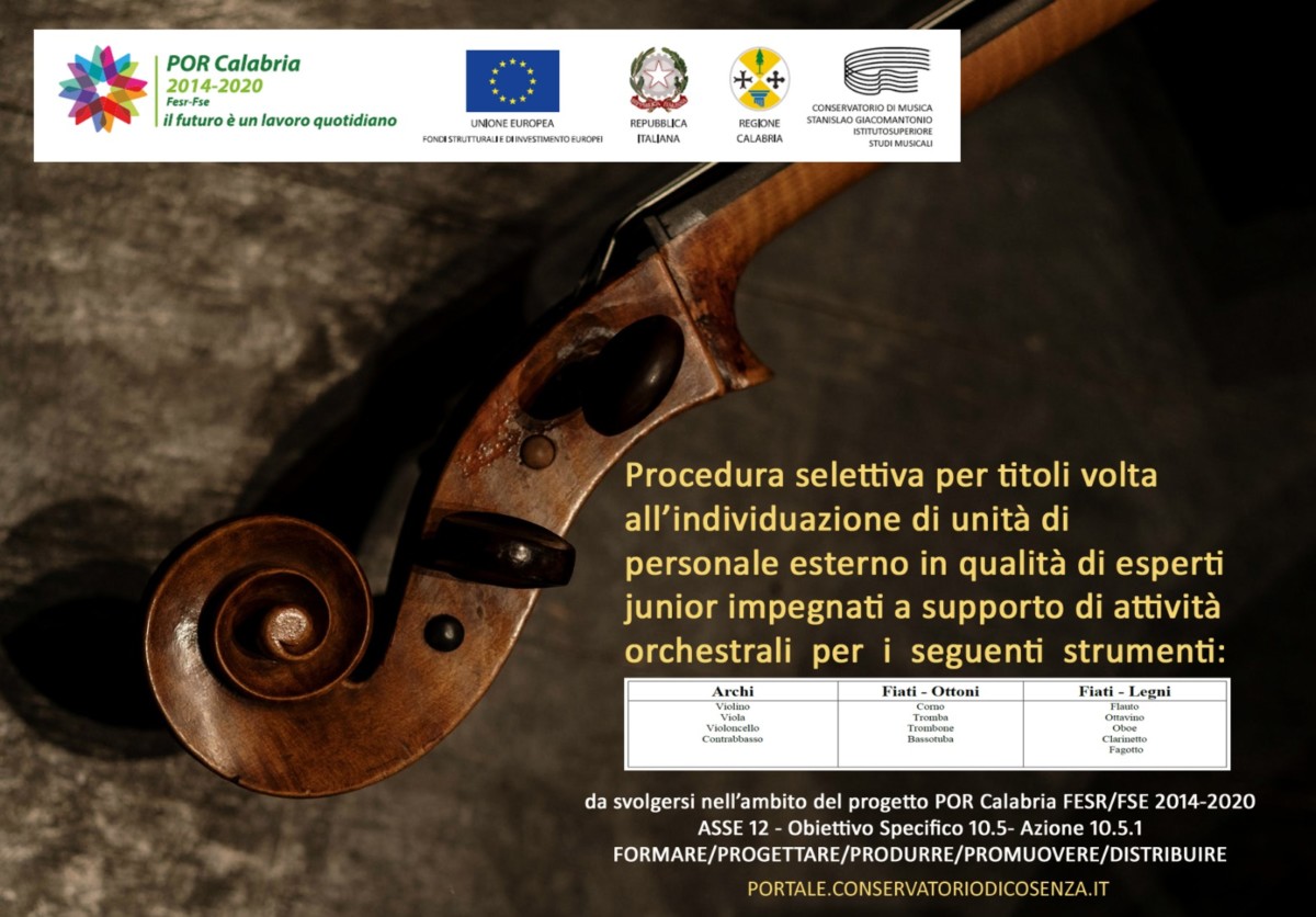 Il Conservatorio di Musica Statale “Stanislao Giacomantonio“ di Cosenza, nell’ambito della programmazione artistica, bandisce una procedura selettiva per titoli volta all’individuazione di unità di personale esterno in qualità di esperti impegnati a supporto di attività orchestrali con scadenza 4 giugno 2021.