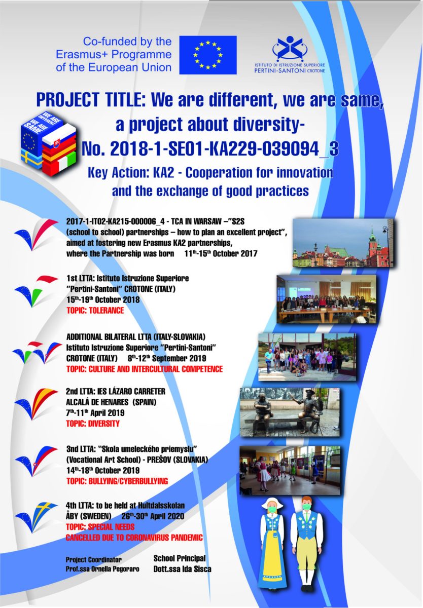 Dei cinque meeting previsti ne sono stati svolti quattro: due presso l’IIS “Pertini-Santoni sulla tolleranza e educazione interculturale (Ottobre 2018 e Settembre 2019), uno in Spagna sulla diversità, uno in Slovacchia sul bullismo e cyberbullismo.Purtroppo, non si è potuto svolgere l’ultimo meeting in Svezia avente come tema l’inclusione. Ciò nonostante, il lavoro è proseguito attraverso la piattaforma Europea eTwinning che ha consentito con la cooperazione dei Partners in quali hanno creato il prodotto finale del progetto, il “Diversity Toolkit”, una raccolta di buone pratiche da usare per promuovere l’inclusione sociale e lavorare con le diversità. Il toolkit è liberamente scaricabile dal banner dedicato del progetto presente sul sito dell’IIS “Pertini-Santoni”.