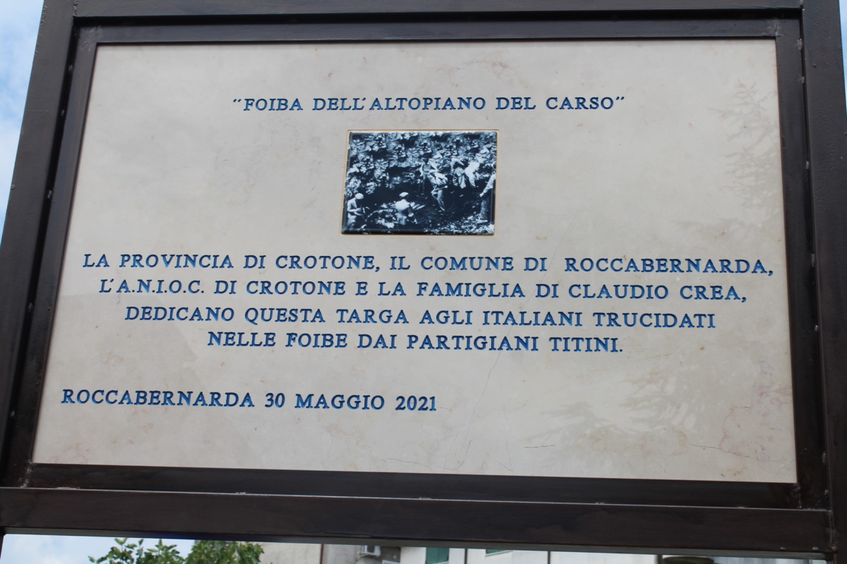 Domenica 30 maggio 2021, l’A.N.I.O.C. (Associazione Nazionale Insigniti Onorificenze Cavalleresche), delegazione provinciale di Crotone e la famiglia di Claudio Crea, hanno inteso omaggiare la cittadina di Roccabernarda, nel crotonese, di un monumento dedicato a tutti gli ex internati nei campi di concentramento nazisti e una targa ricordo alle persone trucidate nelle Foibe del Carso, dai partigiani titini.