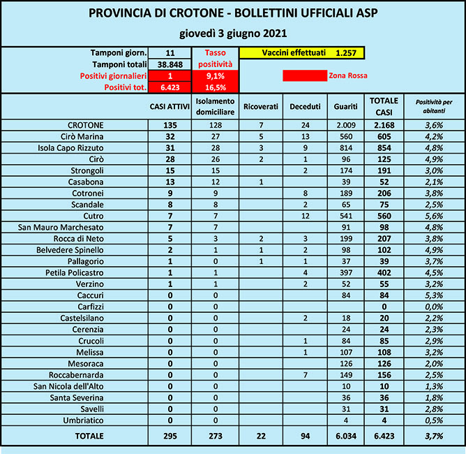 Nei soli primi tre giorni di giugno la situazione pandemica nella provincia di Crotone prosegue la sua rassicurante curva discendente, con un calo di casi attivi complessivi che passa dai 444 registrati al 31 maggio ai 295 di ieri, cioè 149 in meno (-34%); unico dato invariato riguardano i 22 posti letto ancora occupati nei reparti covid, mentre i decessi salgono da 91 a 94.