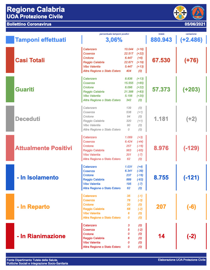 Coronavirus: 257 casi positivi nel crotonese e 8.976 in Calabria, Bollettino completo del 5 giugno