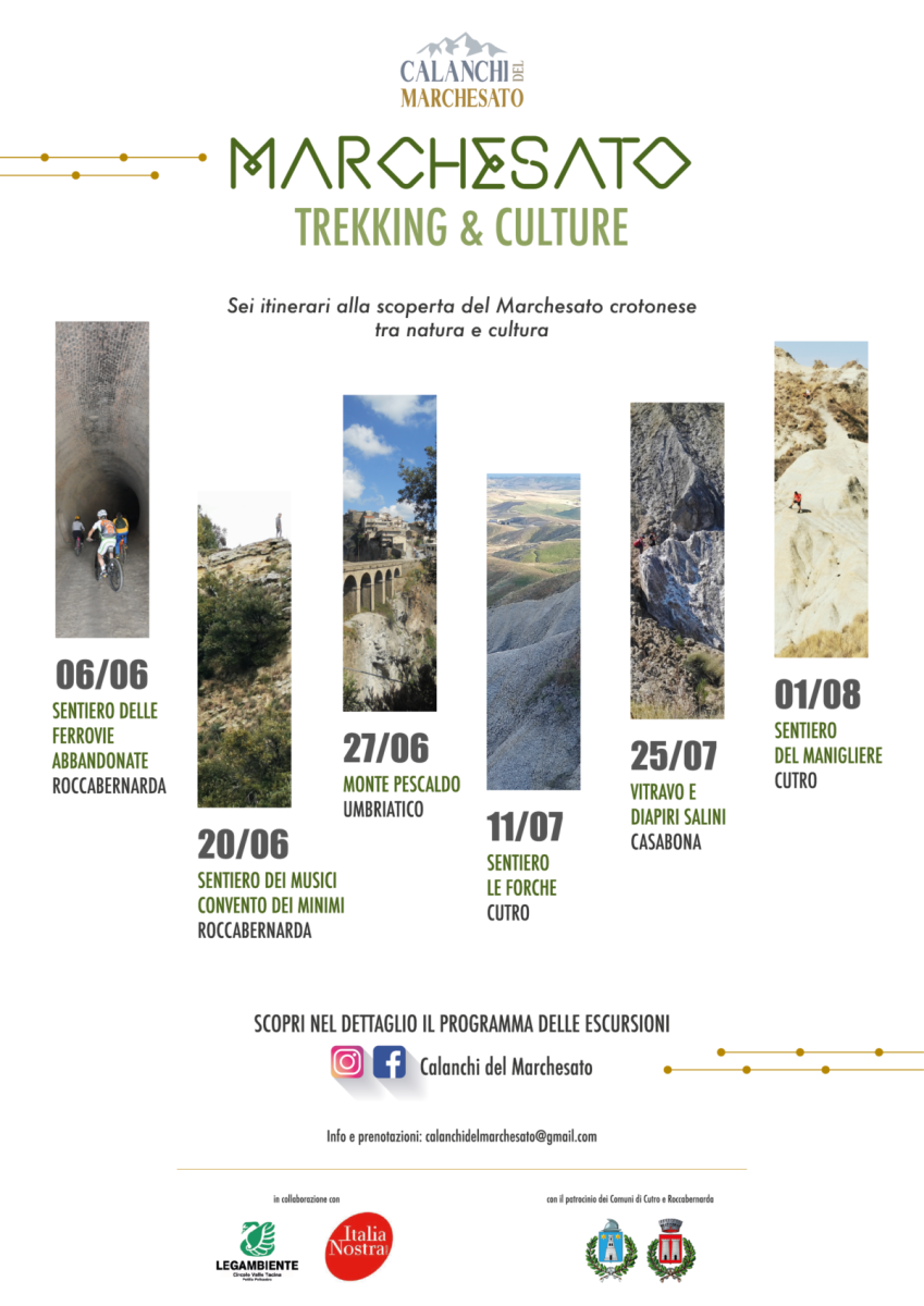 Sei tappe da scoprire ed apprezzare per conoscere al meglio le aree interne del Marchesato Crotonese: uno scrigno di biodiversità caratterizzato da evidenze naturalistiche, storiche e paesaggistiche di struggente bellezza. Marchesato Trekking & Culture offre a turisti e locali, escursionisti e non l’opportunità di vivere un’esperienza entusiasmante a contatto con la natura e con la cultura locale, tra calanchi e biancane, antiche ferrovie abbandonate, sculture di sale, fiumi, montagne e borghi sospesi nel tempo.