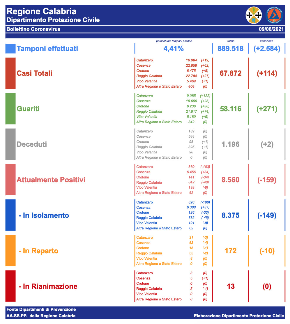 – Catanzaro: CASI ATTIVI 860 (31 in reparto, 3 in terapia intensiva, 826 in isolamento domiciliare); CASI CHIUSI 9.224 (9.085 guariti, 139 deceduti).