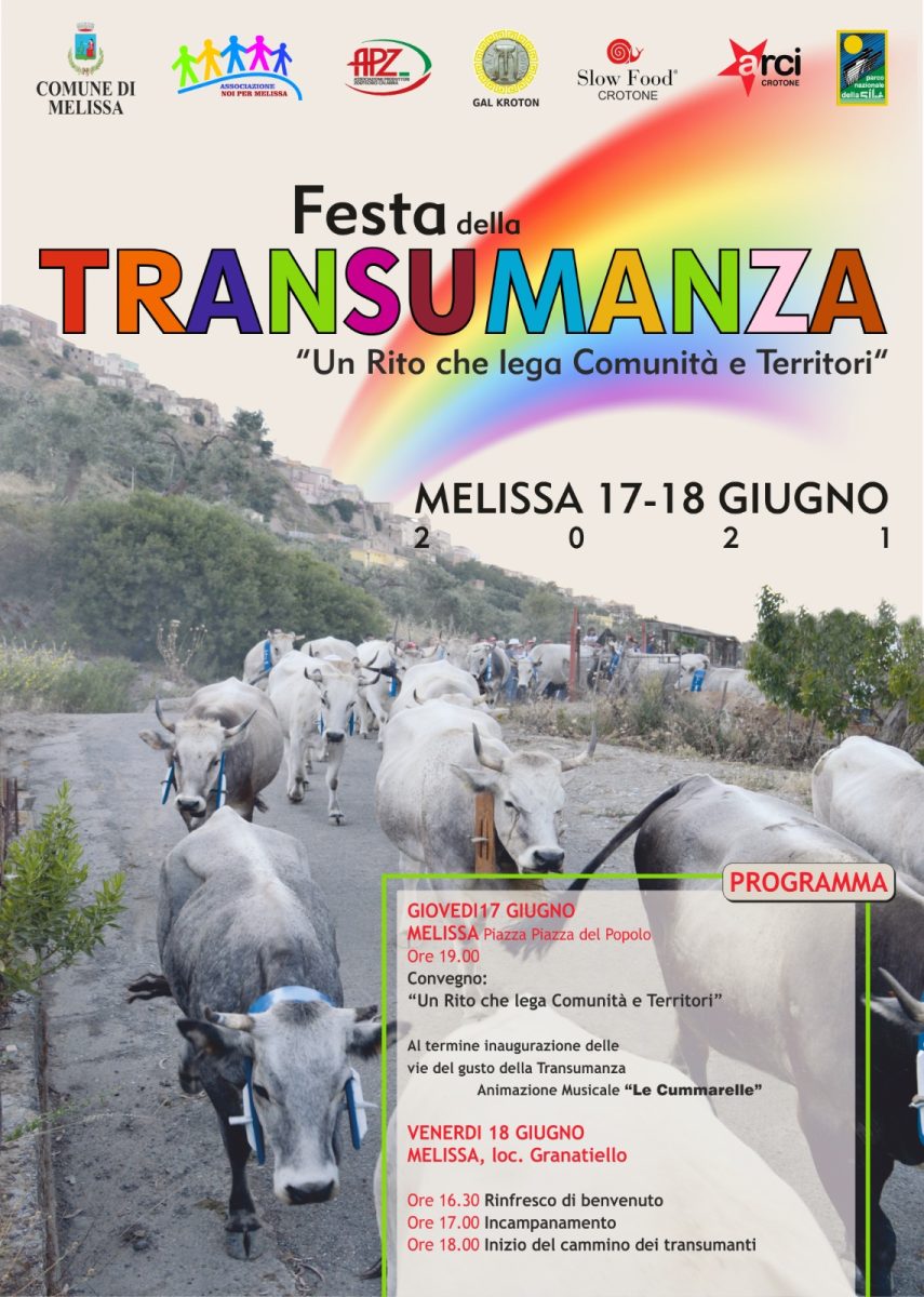Si rinnova il rito della Transumanza a Melissa. Due giorni 17 e 18 Giugno all’insegna della cultura, dell’identità, della natura e della convivialità. L’evento è organizzato dal comune di Melissa unitamente all’Ente Nazionale Parco della Sila, il Gal Kroton, APZ, Slow Food, Arci Crotone ed Associazione Cantieri Rurali, obiettivo far conoscere ed apprezzare una delle tradizioni più antiche della nostra terra.  Si parte giovedì 17 giugno in piazza del Popolo a Melissa con l’incontro: “Un rito che lega le comunità e i territori” a cui seguirà l’inaugurazione delle vie del gusto della transumanza con l’animazione musicale “Le Cummarelle”.Venerdì 18 alle 16,30 in località Granatello a Melissa presso l’azienda Filosa ci sarà il  raduno a cui seguirà l’incampanamento e subito dopo partenza per i pascoli silani.