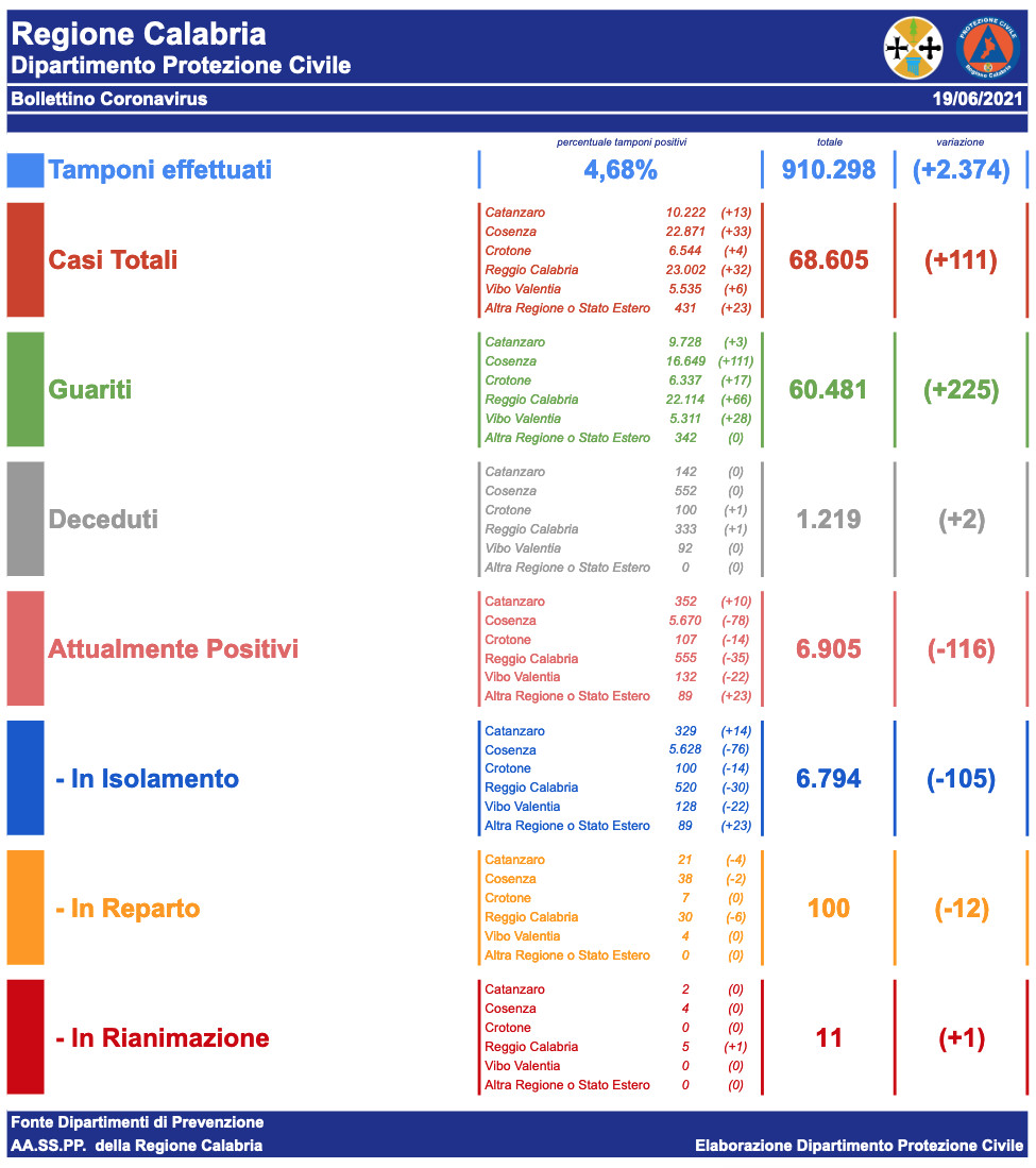 – Reggio Calabria: CASI ATTIVI 555 (30 in reparto, 5 in terapia intensiva, 520 in isolamento domiciliare); CASI CHIUSI 22447 (22114 guariti, 333 deceduti)