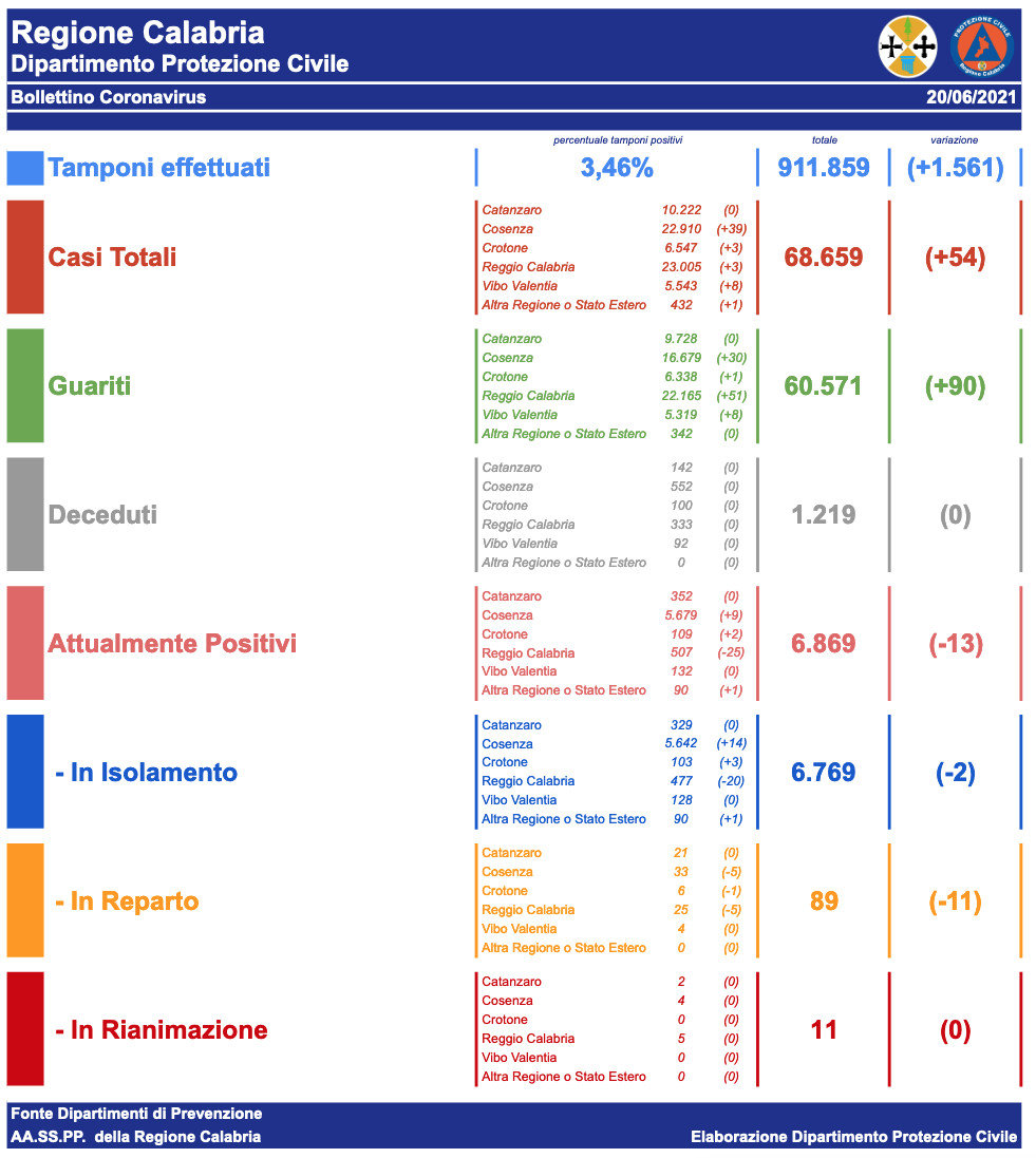 – Crotone: CASI ATTIVI 109 (6 in reparto, 0 in terapia intensiva, 103 in isolamento domiciliare); CASI CHIUSI 6438 (6338 guariti, 100 deceduti)