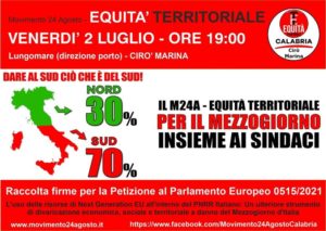 Nel suo comunicato diffuso, parla dell’incontro avvenuto a Roma tra il Premier Draghi e la Presidente della Commissione europea Ursula Von Der Leyen, la quale ha confermato l’appoggio totale della Ue e che l’Italia diventi motore di crescita della Ue; “Spendere tutto, bene e con onestà” ha ribadito il Premier Draghi.Peccato, dice la Gallello, che in questo “spendere bene e con onestà”, la disonestà è già evidente e con mancanza di rispetto, come sempre verso il Sud. L’Ue è stata chiara, è necessario che l’Italia riparti, ma questa ripartenza deve avvenire risanando e ricostruendo il Sud, senza il quale, è l’Italia stessa che non può ripartire. Inutile ripetere quant’è ingiusta questa Italia verso il Sud, da sempre. “Equità Territoriale, che è da mesi impegnata con una petizione a riguardo, cioè spendere bene significa dare la possibilità al Sud di risollevarsi, punto fermo nel pensiero dell’Ue, sta raccogliendo firme in diversi Comuni del Sud con banchetti e manifestazioni, per cercare, fino all’ultimo respiro, fino all’ultimo giorno possibile, di convincere chi di dovere, a dare al Sud quanto spetta e non l’accontentino, il Sud non vuole elemosine e non ne accetta, il Sud vuole giustizia, il Sud vuole equità della ripartizione del Recovery Fund. Da qui l’invito alla cittadinanza di recarsi Venerdì 2 luglio, sul lungomare direzione porto, alle spalle della chiesa patronale, dove il Circolo di Equità Territoriale di Cirò Marina, sarà presente, dalle ore 19:00 alle ore 21:00, con il suo banchetto per raccogliere quanto più firme possibile. Invitiamo tutti a firmare per l’ennesima ingiustizia verso il nostro amato Sud.