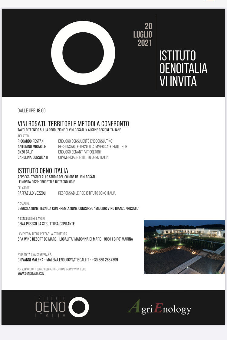 Martedì 20 luglio presso la nuova struttura ‘Spa Wine Resort De Mare’ in località Madonna di Mare a Cirò Marina, si terrà l’evento HAPPY ENOLOGY Calabria 2021 organizzato dall’azienda AGRIENOLOGY srl di Giovanni Malena in collaborazione con l’Istituto OENOITALIA di Erbusco (BS).