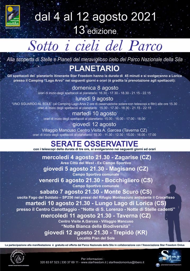 Si chiama “Sotto i cieli del Parco” ed è la manifestazione promossa per il tredicesimo anno consecutivo dall’Ente Parco Nazionale della Sila, con la collaborazione dell’associazione Star Freedom Onlus, per andare alla scoperta di stelle e pianeti. Da giovedì 4 fino al prossimo 12 agosto, l’attesa iniziativa di educazione ambientale e promozione turistica ha così in programma diversi appuntamenti sia al Planetario, su Lorica e Villaggio Mancuso, che in notturna in diverse località silane. Fanno parte degli eventi – tutti totalmente gratuiti e organizzati nel pieno rispetto delle normative anti Covid – anche le sessioni di osservazione del sole con appositi filtri e, ancora, gli incontri con astrofili professionisti per ammirare, direttamente dall’altopiano silano, la volta celeste e conoscerne storie, antiche leggende, miti. Per partecipare occorre effettuare la prenotazione.