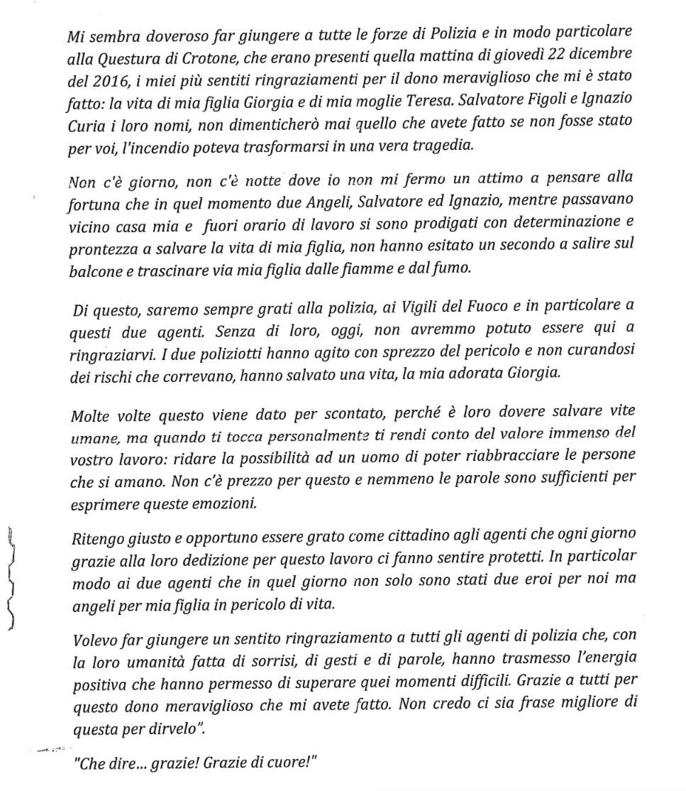 Ed è stata in questa occasione che un cittadino è voluto intervenire direttamente a ringraziare due agenti della Questura di Crotone, dedicando loro una lettera contenente un messaggio di stima e gratitudine, per essersi prodigati anni prima, nel salvataggio della sua famiglia intrappolata da un incendio in casa.