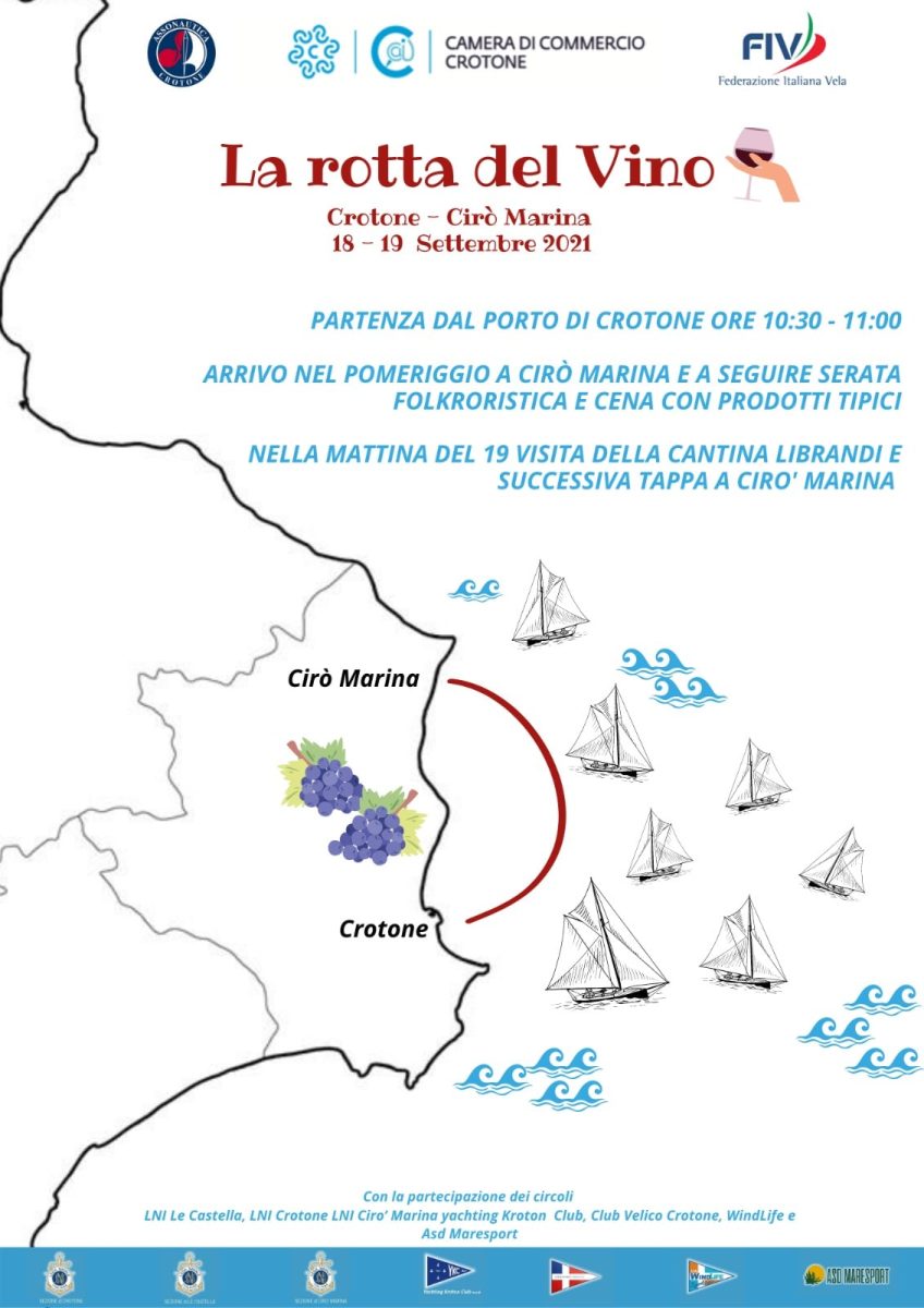 Domenica 19 settembre 2021 si è conclusa l’iniziativa “La rotta del Vino”, nonostante le condizioni meteo minacciassero temporali. Le imbarcazioni con i rispettivi armatori, Riccardo Proto, Sabino Vetta, Emiliano Lauro, Alfonso Valenti ,Bonaventura Pugliese (Venturino),Andrea Travierso ,Renato Sisca ,Giuseppe Congi ,Domenico Arcuri ,Giorgio Coppola ,Francesco Greco ,Mario Caccavo ,Sergio Torchia ,Antonio Stratico’ e Franco Basta, con i loro rispettivi equipaggi, sono partiti dal porto di Crotone alle 11:30, con arrivo alle 14:15 di sabato nel porto di Cirò Marina.