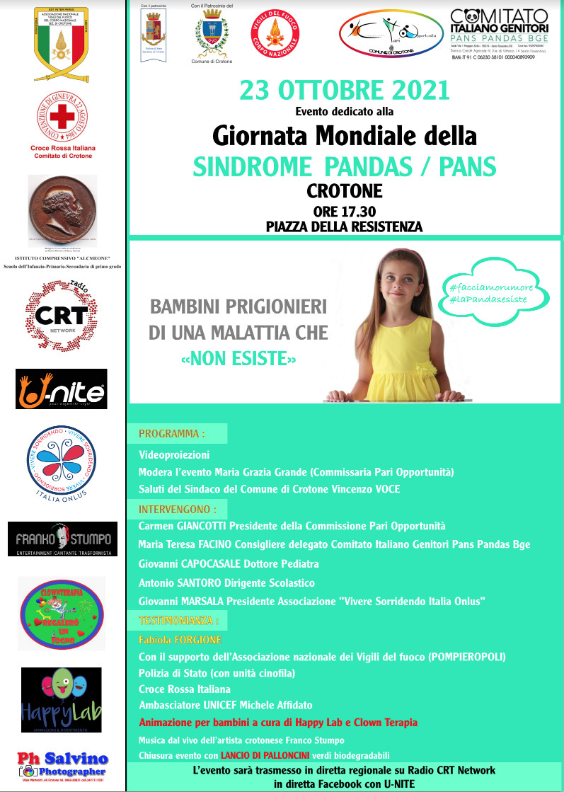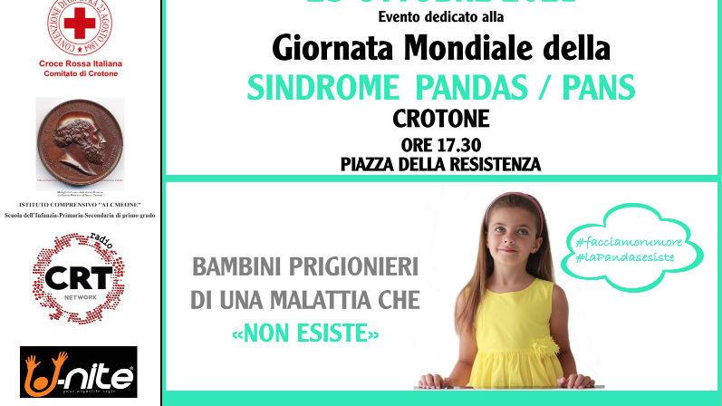 Si terrà domani sabato 23 ottobre 2021 dalle ore 17.30 in piazza della Resistenza l’evento promosso dalla Commissione Pari Opportunità, presieduta dalla Consigliera Comunale Carmen Giancotti, in occasione della Giornata Mondiale della Sindrome Pandas/Pans che, a causa delle avverse condizioni meteo, non si è potuto tenere lo scorso 9 ottobre.