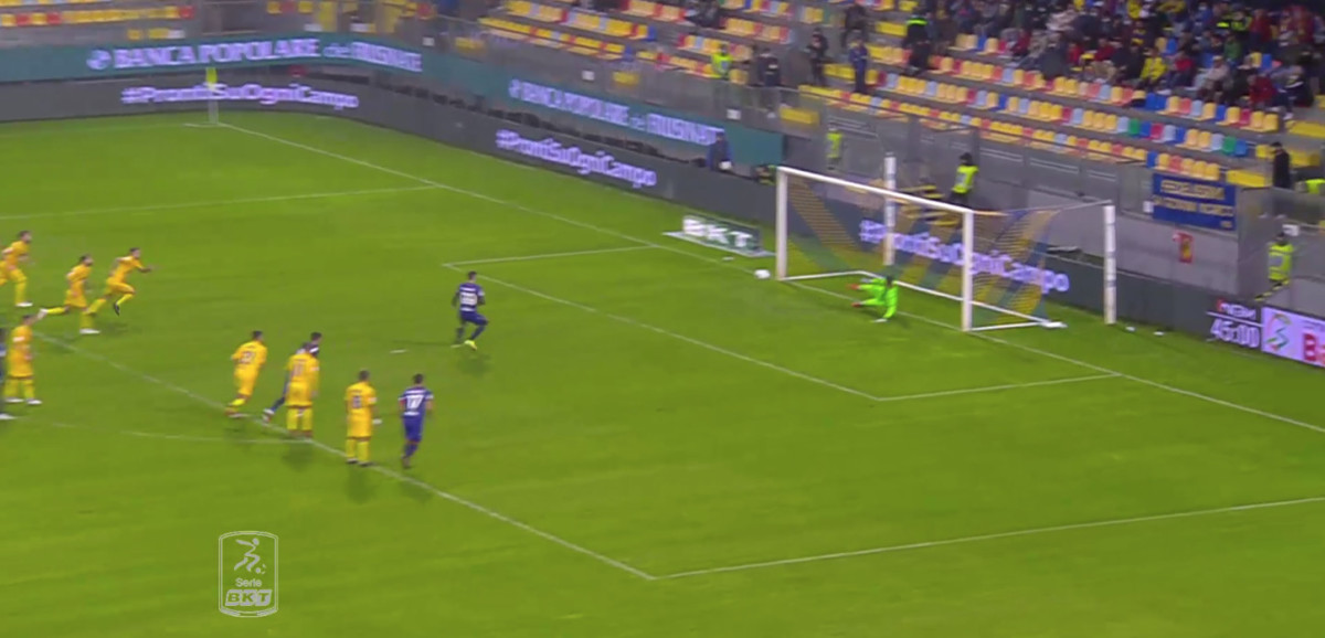 La gara la fanno subito, come prevedibile, i padroni di casa: gli squali provano a difendersi con ordine ma devono fare gli straordinari, immolandosi in area, Donsah (8′), Paz (14′) e Sala (19′) per evitare guai. Poi è Contini a salire in cattedra al 26′ con un super intervento sull’incornata a colpo sicuro di Charpentier (26′). Pian piano i rossoblù prendono coraggio, trovano distanze e meccanismi e si affacciano in area avversaria prima con Vulic (30′) ben imbeccato dal filtrante di Mulattieri, poi con il tiro del numero nove lanciato in verticale da Donsah (38′) e infine sempre con una girata ravvicinata del capocannoniere della serie B deviata con il braccio da Casasola: il signor Abbattista assegna il rigore, dal dischetto va Maric e trasforma con freddezza glaciale per lo 0-1 (45+1′). Ma i ciociari non ci stanno e pareggiano subito con Charpentier, bravo a farsi trovare pronto sull’invito dalla destra di Canotto e a superare l’incolpevole Contini trovando il pareggio, subito prima del fischio di fine primo tempo, al 3′ di recupero.