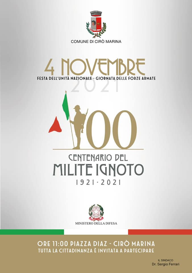 Esattamente 100 anni fa, il 4 novembre 1921, ebbe luogo la tumulazione del Milite Ignoto nel sacello dell’Altare della Patria.Nel giorno del Centenario, domani, in occasione della commemorazione dei caduti in guerra , l’Amministrazione Comunale conferirà la Cittadinanza Onoraria al Milite Ignoto con la consegna di una pergamena ai Carabinieri di Cirò Marina.
