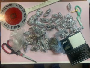 Gli agenti pertanto, decidevano di fermare il soggetto trovando all’interno del sacchetto che era in suo possesso poco prima, complessivamente 91,23 grammi di marijuana suddivisa in 44 dosi racchiusi in della carta stagnola e altri due in involucri di cellophane oltre che due paia di forbici e un bilancino.