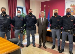 Il Questore Marco Giambra ha voluto ringraziare personalmente i poliziotti delle Volanti che nella serata del 3 novembre, di fronte all’imbarcazione arenata a largo di “le Cannella” e a decine di migranti in difficoltà, non hanno esitato, a rischio della loro incolumità, a raggiungere il veliero in mare e dare il proprio determinante contributo al salvataggio delle loro vite, evidenziando eccezionale spirito di servizio e di sacrificio.