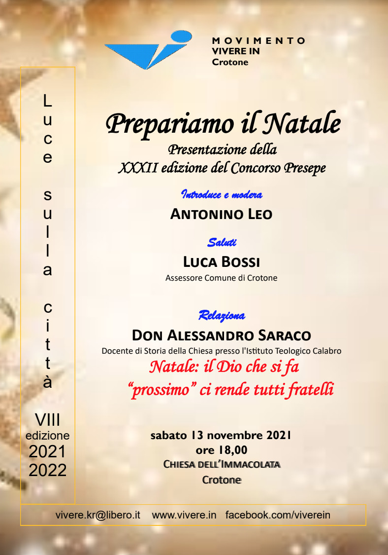 Sabato 13 novembre nell’ambito del cartellone Luce sulla Città giunto alla ottava edizione il Movimento Vivere In ha organizzato una conversazione sul tema “Natale: il Dio che si fa “prossimo” ci rende tutti fratelli”, che sarà anche il tema del XXXII° Concorso Presepe.