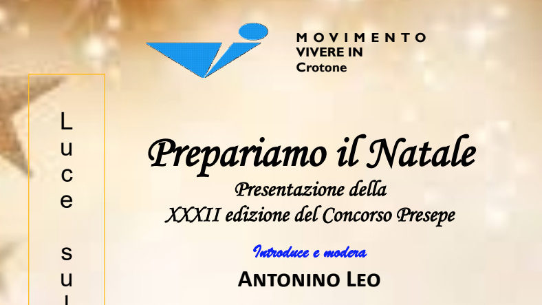Sabato 13 novembre nell’ambito del cartellone Luce sulla Città giunto alla ottava edizione il Movimento Vivere In ha organizzato una conversazione sul tema “Natale: il Dio che si fa “prossimo” ci rende tutti fratelli”, che sarà anche il tema del XXXII° Concorso Presepe.