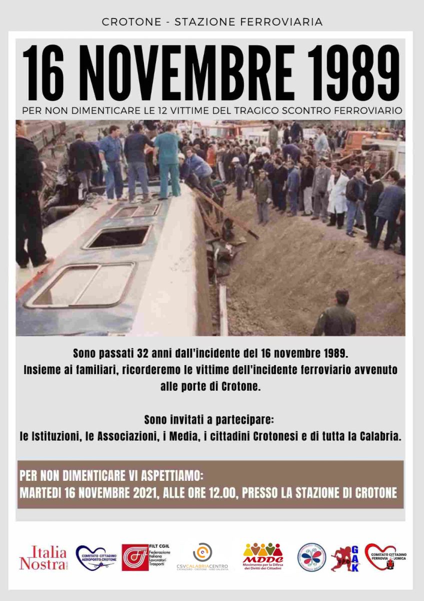 Le associazioni Italia Nostra, Gruppo Archeologico Krotoniate, il Movimento per la Difesa dei Diritti dei Cittadini, Filt-Cgil, il Comitato cittadino ferrovia jonica, il Comitato cittadino aeroporto Crotone, l’associazione Vivere Sorridendo Italia onlus ed il CSV Calabria Centro, si riuniranno anche quest’anno per ricordare le vittime dell’incidente ferroviario accaduto a Crotone nel 1989.