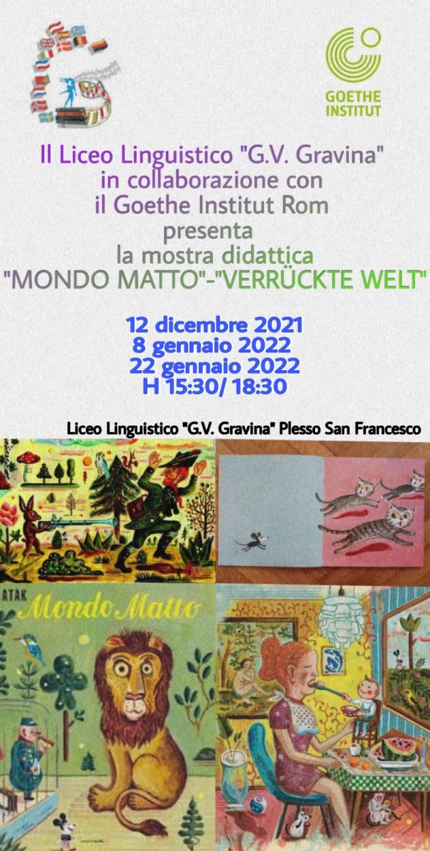 Al plesso San Francesco, che ospita gli indirizzi linguistico, musicale e coreutico, tra le altre cose sarà allestita la mostra “Mondomatto – Verrückte Welt” dell’illustratore tedesco Atak (Georg Barber). Atak è un artista, graphic designer e illustratore che vive e lavora a Berlino. Oggi è considerato uno degli artisti più promettenti e innovativi della scena culturale tedesca. Le illustrazioni colorate del libro Verrückte Welt dell’artista berlinese ATAK invitano grandi e piccoli ad un viaggio di investigazione. Saranno direttamente gli alunni del Gravina a mostrare i quadri e a spiegare le rappresentazioni sia in inglese che in tedesco. Gli alunni presenteranno la mostra, parleranno dell’artista e del significato della mostra in lingua italiana, in inglese e in tedesco. Una mostra che intreccia l’arte e le lingue, abilmente presentata dagli alunni del liceo linguistico. La mostra è curata dalla prof.ssa Emilia Esposito in collaborazione con il Goethe Institut Rom.