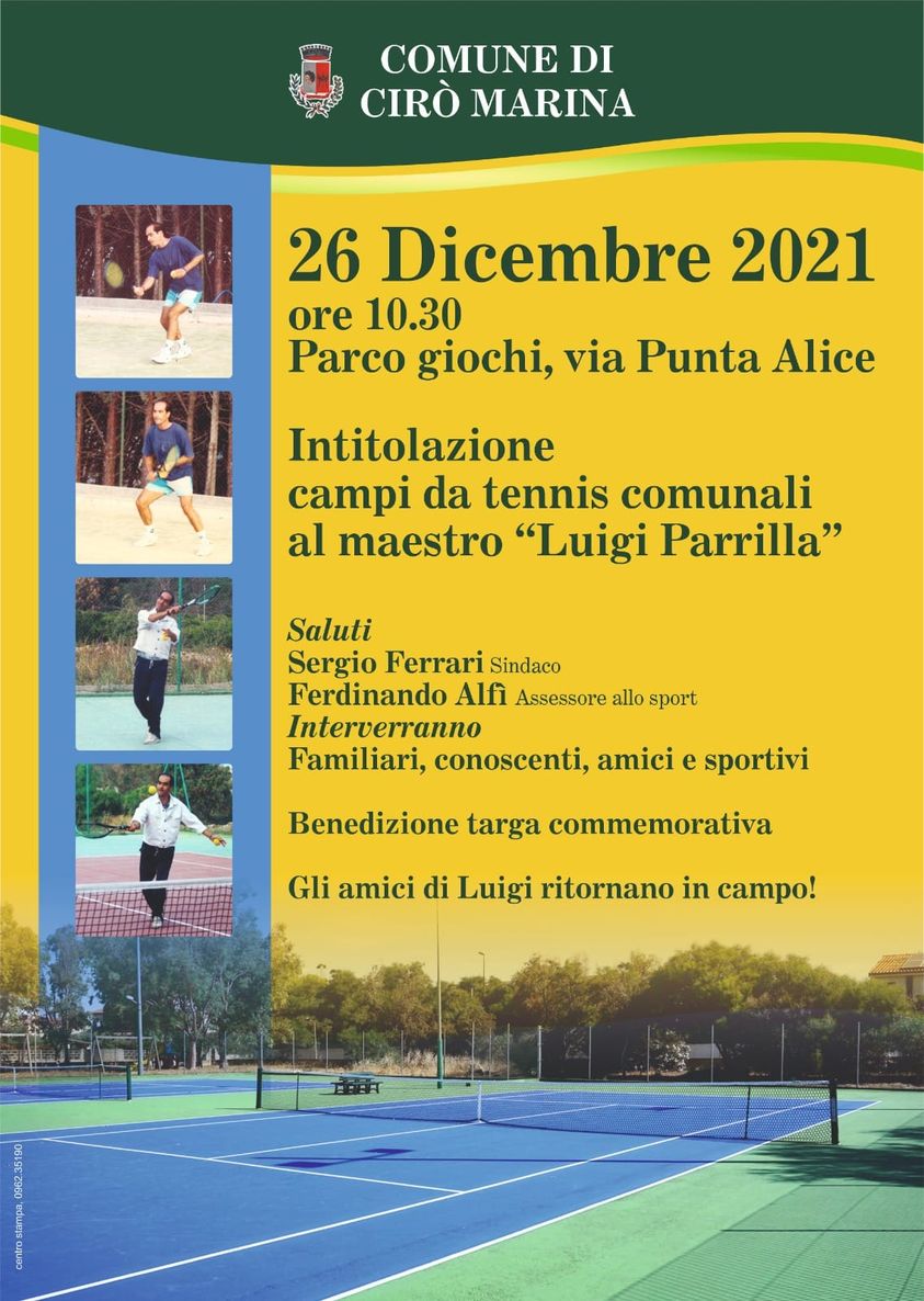 “L’amministrazione comunale giorno 26 Dicembre 2021 intitolerà i campi da tennis comunali al nostro compianto concittadino, Luigi Parrilla, scomparso il 26 Dicembre 2009 per onorare il suo impegno e il suo prezioso contributo a questo sport.” Così si legge nella delibera pubblicata sul sito del Comune di Cirò Marina. Una delibera formulata all’unanimità , dopo la lettura della motivazione avanzata dall’assessore allo sport, Ferdinando Alfì, che la Giunta all’unanimità, guidata Sindaco, Sergio Ferrari, hanno voluto accogliere e formulare. Una titolazione che dà il meritato riconoscimento ad un nostro concittadino che allo sport e al tennis nello specifico, ha dedicato tutta la sua vita, vissuta con passione e spirito fraterno, nella nostra comunità e oltre, favorendo la diffusione dei valori dello sport e dell’amicizia. Per chi lo ha conosciuto e con lui ne ha condiviso momenti di sport e non solo, un tuffo nei ricordi dei bellissimi momenti vissuti sui campi della “Pagoda”, diventati un punto di riferimento per tutti gli sportivi, amanti del tennis e non solo, dove il caro Luigi trascorreva gran parte della sue giornate. Oggi, questo importante riconoscimento alla memoria che sicuramente servirà per dare slancio alla voglia di sport e alla vita.