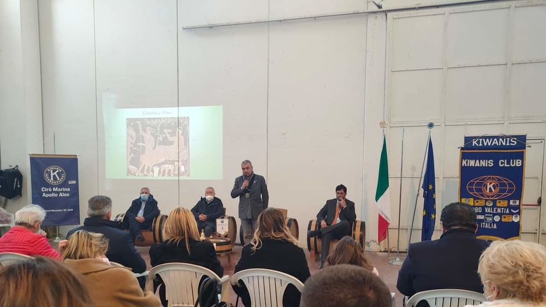 Nella storica cantina Francesco Malena di Cirò Marina si è svolta, nel pieno rispetto delle norme sulla sicurezza Covid, la Festa del vino e dell’amicizia organizzata dal Club Kiwanis Apollo Aleo. Sono intervenute diverse autorità pubbliche e kiwaniane. Hanno portato il saluto l’Assessore alla cultura del Comune di Cirò Marina Virginia Marasco, il Vicesindaco del Comune di Melissa Macrì, il past Luogotenente della Divisione XII del Kiwanis Basilio Valente e il Segretario della stessa Divisione Titti Mauro. Hanno aperto i lavori il Presidente del club Antonio Francesco Amodeo e il Cerimoniere Filomena De Fine. I relatori sono stati il Prof. Giuseppe Germanò, docente universitario di cardiologia e medicina interna, che si è soffermato sugli effetti benefici del vino sulla salute, e il Dott. Giuseppe Nicoletti, funzionario archeologo della Soprintendenza ABAP di CZ e KR referente per la provincia di Crotone, che ha relazionato sulla storia della vite dalle prime comparse nelle civiltà antiche fino al Medioevo. Oltre i temi culturali è stata effettuata una riffa allo scopo di raccogliere fondi destinati ai vari service organizzati dal Kiwanis per aiutare i bambini più bisognosi. I premi della riffa sono stati: un oggetto di gioielleria donato dal maestro orafo Michele Affidato, un cesto natalizio regalato dal socio Giorgio Pucci e una confezione di vino offerto dal padrone di casa Cataldo Malena.
