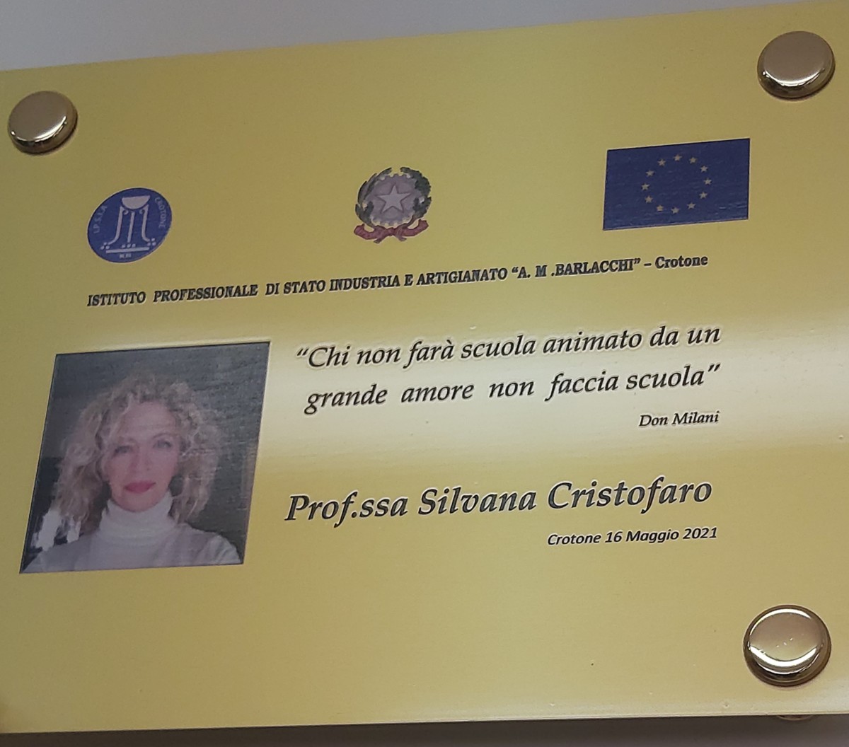 La famiglia della docente ha istituito due borse di studio. All’evento era presente la dirigente scolastica Serafina Rita Anania, il marito della professoressa Cristofaro, l’ing. Vincenzo Lombardo con la figlia Chiara, la sorella la prof,ssa Cristofaro , la cognata professoressa Maria Lombardo, una rappresentanza degli alunni del corso moda dove la professoressa Silvana insegnava. Presente anche il sindaco di Crotone nonchè collega Enzo Voce ed il presidente del consiglio d’Istituto Nicola Cavallo. “Chi non farà scuola animato da un grande amore non faccia scuola”- questa la citazione sulla targa ubicata nella sala docenti dell’Istituto. Grande commozione da parte della Dirigente Anania nel ricordare questa straordinaria figura- Ricordarla è un grande dolore che esprime i nostri sentimenti, con grande commozione gli dedichiamo la nostra sala dei professori. La famiglia della professoressa ha voluto istituire due borse di studio in matematica per ricordare l’amore per l’insegnamento e l’attaccamento verso gli alunni della cara Silvana, per favorire il diritto alla studio, incentivare la prosecuzione del percorso formativo e personale di studenti che si siano distinti per impegno. Saranno due le borse di studio da assegnare, una per l’anno 2020/2021 (3H E 4 H Moda) ed una per l’anno in corso 2021/2022 ciascuno di 750 euro, a cui una commissione assegnerà all’alunno/a del 4H e 5 H Moda che riporterà in pagella il voto più alto in matematica. Le borse di studio verranno consegnate direttamente agli alunni durante una cerimonia pubblica che si terrà alla fine dell’anno scolastico. “Oggi sono qui non come sindaco ma come amico e collega- ha detto il sindaco di Crotone Enzo Voce nel suo intervento-Silvana continuerà sempre ad essere tra noi, la sua memoria sarà sempre viva”. ” La mia famiglia ha apprezzato molto ciò che avete organizzato per mia moglie”, –ha detto commosso il marito della professoressa Cristofaro l’ingegnere Vincenzo Lombardo, -ringrazio la dirigente scolastico per la sua sensibilità che ha voluto omaggiare la memoria di Silvana, ma anche tutto il corpo docente e gli studenti che mia moglie amava tanto. Era una fonte di ispirazione continua un esempio per i futuri professionisti che si affacceranno sul mondo del lavoro. Per questo- conclude abbiamo voluto istituire due borse di studio. In memoria della professoressa Cristofaro, la dirigente Anania ha voluto donare alla famiglia Lombardo una pergamena a cui affidare la sua memoria all’IPSIA A.M.Barlacchi e agli alunni che avranno il merito di accogliere l’eredità preziosa del suo esempio e dei suoi insegnamenti. “L’amore incondizionato per la scuola, si legge ancora- la dedizione di se agli altri, l’onestà la costanza, l’umanità e l’impegno solerte, siano strumenti cui attingere per l’avvenire, doni inestimabili attraverso cui apprendere e ricordare la grande opera della prof.ssa Silvana Cristofaro. Ci sono eredità che trascendono i limiti fisici diventano monumenti imperituri.”