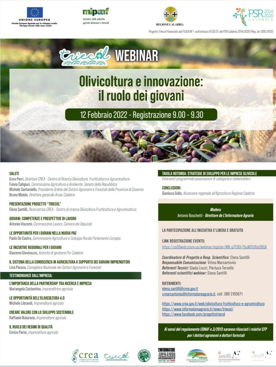 Prosegue senza soste il percorso di Triecol, il progetto promosso dalla sede di Rende del Centro di Ricerca Olivicoltura, Frutticoltura e Agrumicultura del CREA (CREA OFA), finanziato attraverso la misura 1, sottomisura 1.2.1 “Sostegno per progetti dimostrativi e azioni di informazione” del Psr Calabria 2014/2020. I ricercatori e gli imprenditori agricoli coinvolti nel progetto stanno affrontando le tematiche salienti dell’olivicoltura, focalizzandosi su potenzialità, opportunità e problematiche della filiera, al fine di promuovere uno sviluppo sostenibile del settore, attraverso l’innovazione tecnologica. E per garantire la qualità, la modernità e la redditività, insieme alla tutela dell’ambiente, Triecol, attraverso una serie di webinar informativi/divulgativi, sostiene con fermezza la necessità di un collegamento costante ed efficiente tra il mondo della ricerca scientifica e quello dell’imprenditoria agricola, al fine di garantire con continuità il trasferimento delle conoscenze agli olivicoltori. L’argomento che sarà approfondito nel prossimo webinar del progetto, fissato per sabato 12 febbraio alle ore 9:00, riguarda il ruolo dei giovani nell’olivicoltura e nell’innovazione. Tematica molto attuale, alla luce delle politiche nazionali e comunitarie che spingono verso un ricambio generazionale in agricoltura, al fine di modernizzare il settore, non solo con il trasferimento delle conoscenze alle nuove generazioni, ma anche attraverso attrezzature, metodiche e innovazioni di prodotto e processo che siano al passo con i tempi.