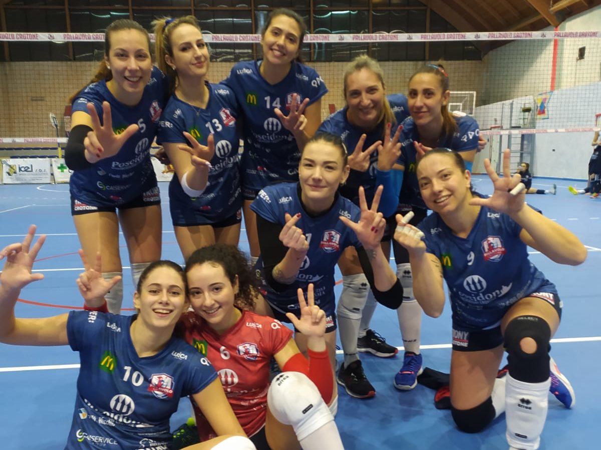Le Sirene della Pallavolo Crotone Iniziano con una netta vittoria la ripresa del campionato vincendo il Derby Regionale contro la VOLLEY REGHION di Reggio Calabria, guadagnando cosi tre punti e raggiungendola in classifica a 14 punti. Una vittoria corale che ha mostrato la voglia delle ragazze di Mister Asteriti di combattere su ogni pallone. Una partita giocata in molte fasi di questa punto a punto tra le due squadre, dove la vittoria è giunta per la grinta e la freddezza in alcuni momenti dell’incontro della formazione di casa. I parziali del set (25-21, 23-25, 25-18, 25-16) mostrano un’inziale equilibro tra le due formazioni che si aggiudicano un set a test dei primi due, per poi veder uscire la coesione della formazione di Crotone, spronata dai molte indicazioni da parte della panchina, nei momenti più critici. Le due migliori finalizzatrici di punti sono state con 17 punti a testa, Aurora Cesario, migliore anche come percentuale di ricezione, che ha lasciato il suo ruolo di Libero di inizio del campionato a Letizia De Rose con cui divideva questa competenza, e Chiara Capponi. Buona la prestazione anche del Palleggiatore Sabadin, che è riuscita a dare il giusto ritmo all’intera squadra. Ottima la prestazione di Michela Greco, che risulta la MVP del Match.