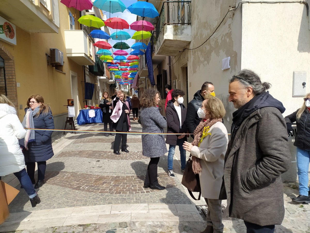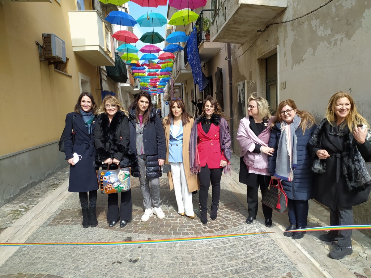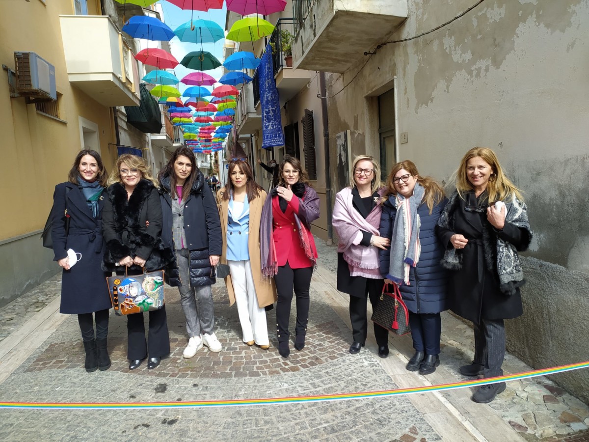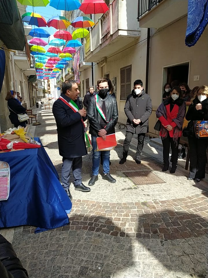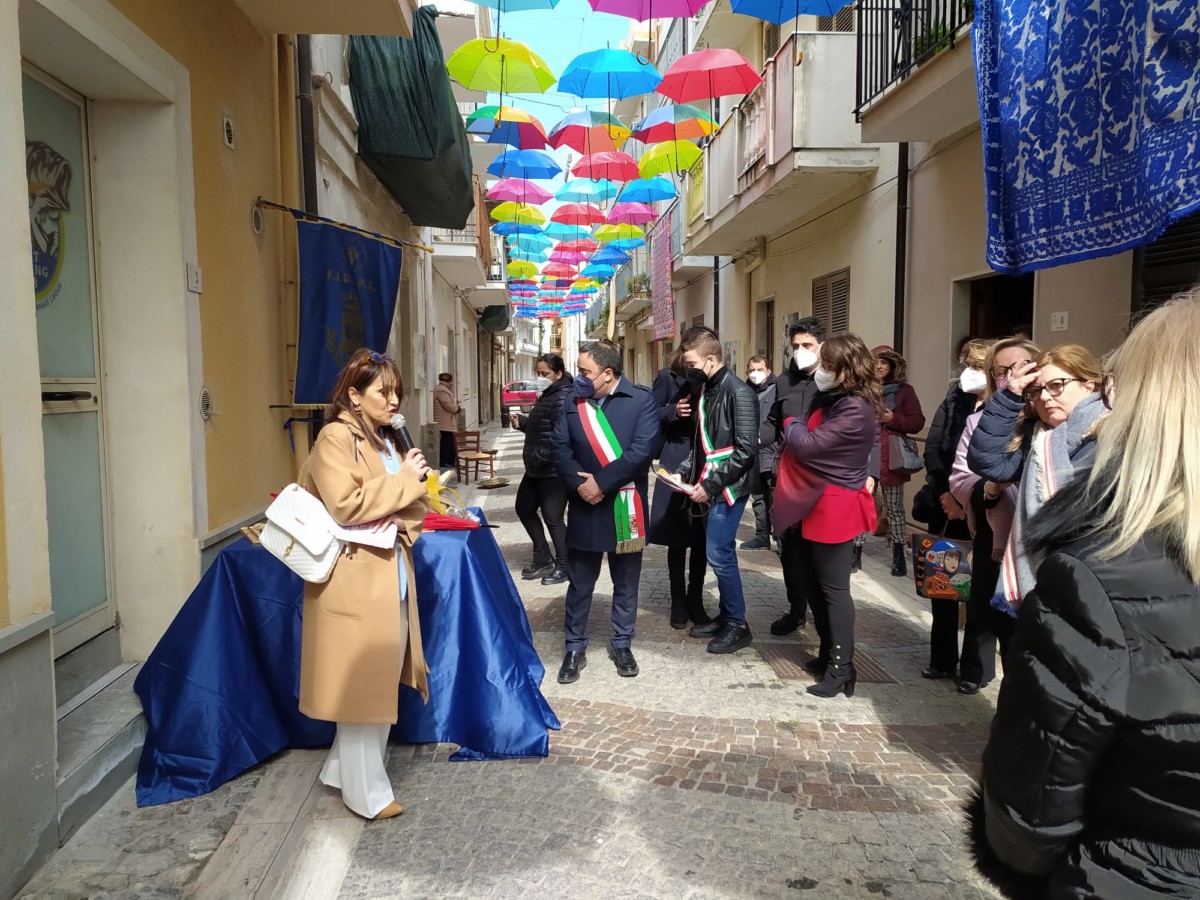 Ombrelli per proteggere simbolicamente tutte le donne, dalla violenza, dai loro affetti, dai loro diritti. Alla presenza del Sindaco, Sergio Ferrari, e dei componenti la giunta comunale intervenuti, la presidente della Fidapa, Anna Russo, ha tagliato il fatidico nastro e inaugurato “la Strada degli ombrelli” che per l’occasione, grazie alla collaborazione con lo studio fotografico Amato, ha esposto lungo la via, vecchie foto che hanno riproposto antiche usanze e personaggi che hanno vissuto in quella via. Fra queste anche l’ex sindaco, Aurora Danili Caparra. Una giornata carica di significati, puntualmente illustrati nel suo intervento dalla presidente della Fidapa, Anna Russo, che ha spiegato come è nata l’idea di dedicare una via della città alla memoria delle donne, fatta propria anche dall’Amministrazione Comunale per voce del Sindaco, Sergio Ferrari, laddove entrambi hanno ribadito l’intenzione di puntare sulla riqualificazione del centro storico con il contributo di tutti, istituzioni e Associazioni. Importante il contributo anche dei due istituti comprensivi, presenti con i loro dirigenti, Giuseppe Di Lillo e Graziella Spinali che hanno sottolineato l’importanza dell’impegno dei giovani e di quanto sia importante il loro coinvolgimento per formare una società più solidale dove possano trovare posto veri sentimenti di pace, tolleranza, solidarietà, ma soprattutto rispetto verso le donne. Sicuramente, in questa giornata, ricordando anche la compianta Antonella Lettieri, alla quale è stato dedicato un momento di doloroso ricordo, la scelta convinta della Fidapa è stata quella di dedicare in una giornata così importante per le sue implicazioni sociali ed umane, un forte momento di riflessione, invitando tutti alla partecipazione attiva per un mondo dove trovino finalmente posto, il riconoscimento del valore delle donne, delle sue capacità, di donne che valorizzano le famiglie soprattutto quando le difficoltà della vita si fanno sentire.