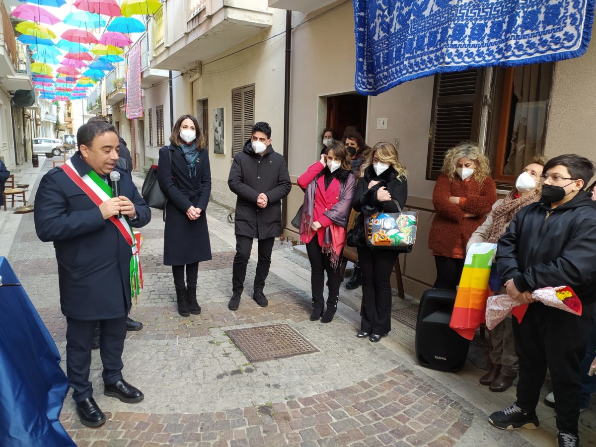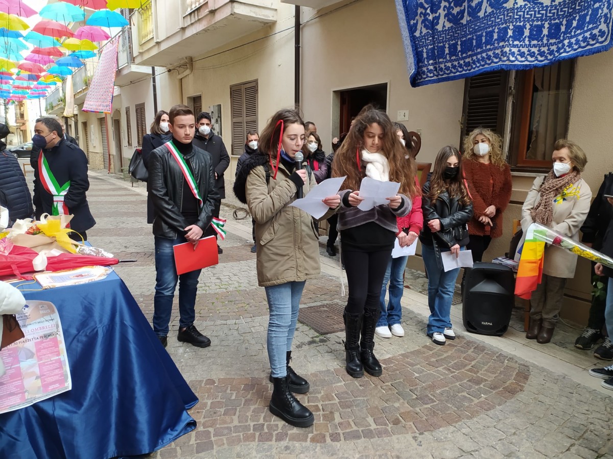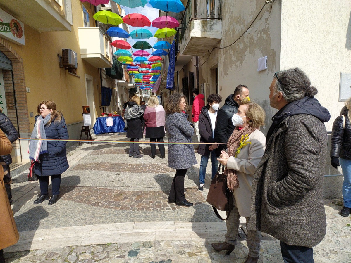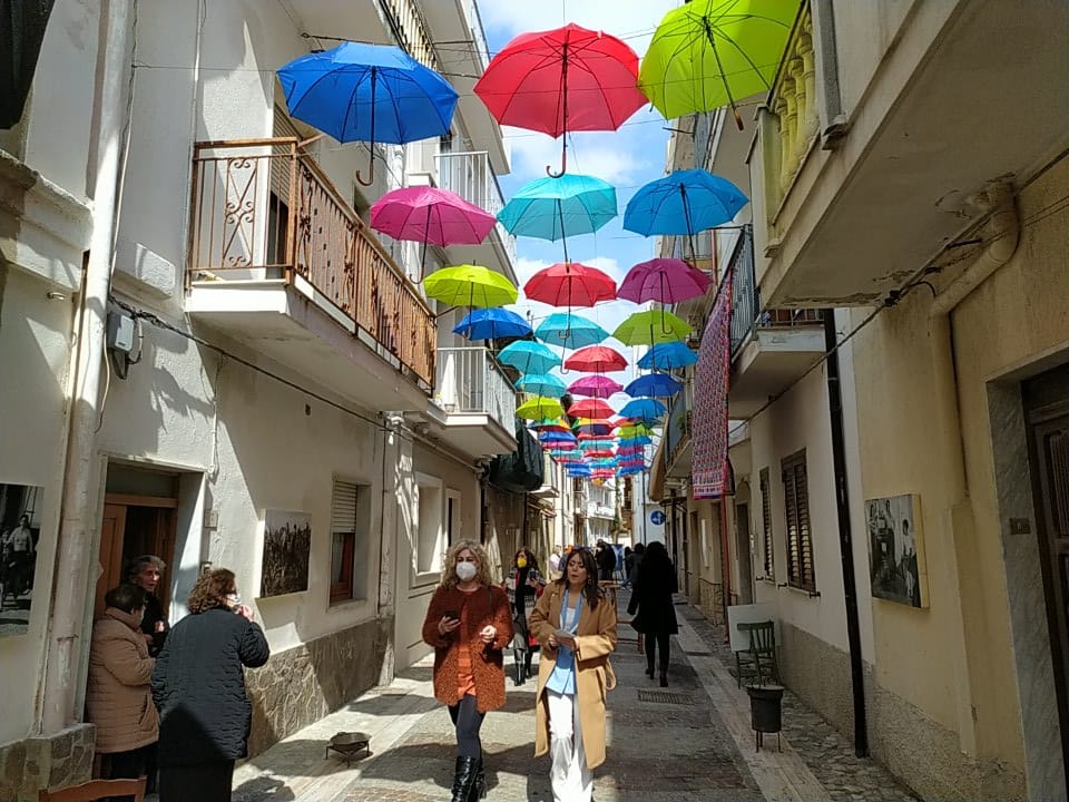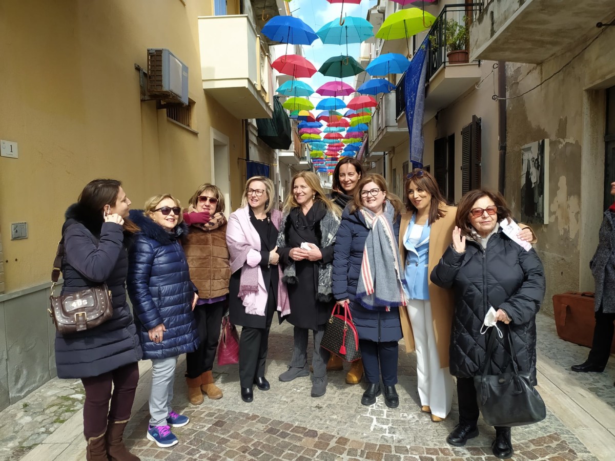 Ombrelli per proteggere simbolicamente tutte le donne, dalla violenza, dai loro affetti, dai loro diritti. Alla presenza del Sindaco, Sergio Ferrari, e dei componenti la giunta comunale intervenuti, la presidente della Fidapa, Anna Russo, ha tagliato il fatidico nastro e inaugurato “la Strada degli ombrelli” che per l’occasione, grazie alla collaborazione con lo studio fotografico Amato, ha esposto lungo la via, vecchie foto che hanno riproposto antiche usanze e personaggi che hanno vissuto in quella via. Fra queste anche l’ex sindaco, Aurora Danili Caparra. Una giornata carica di significati, puntualmente illustrati nel suo intervento dalla presidente della Fidapa, Anna Russo, che ha spiegato come è nata l’idea di dedicare una via della città alla memoria delle donne, fatta propria anche dall’Amministrazione Comunale per voce del Sindaco, Sergio Ferrari, laddove entrambi hanno ribadito l’intenzione di puntare sulla riqualificazione del centro storico con il contributo di tutti, istituzioni e Associazioni. Importante il contributo anche dei due istituti comprensivi, presenti con i loro dirigenti, Giuseppe Di Lillo e Graziella Spinali che hanno sottolineato l’importanza dell’impegno dei giovani e di quanto sia importante il loro coinvolgimento per formare una società più solidale dove possano trovare posto veri sentimenti di pace, tolleranza, solidarietà, ma soprattutto rispetto verso le donne. Sicuramente, in questa giornata, ricordando anche la compianta Antonella Lettieri, alla quale è stato dedicato un momento di doloroso ricordo, la scelta convinta della Fidapa è stata quella di dedicare in una giornata così importante per le sue implicazioni sociali ed umane, un forte momento di riflessione, invitando tutti alla partecipazione attiva per un mondo dove trovino finalmente posto, il riconoscimento del valore delle donne, delle sue capacità, di donne che valorizzano le famiglie soprattutto quando le difficoltà della vita si fanno sentire.