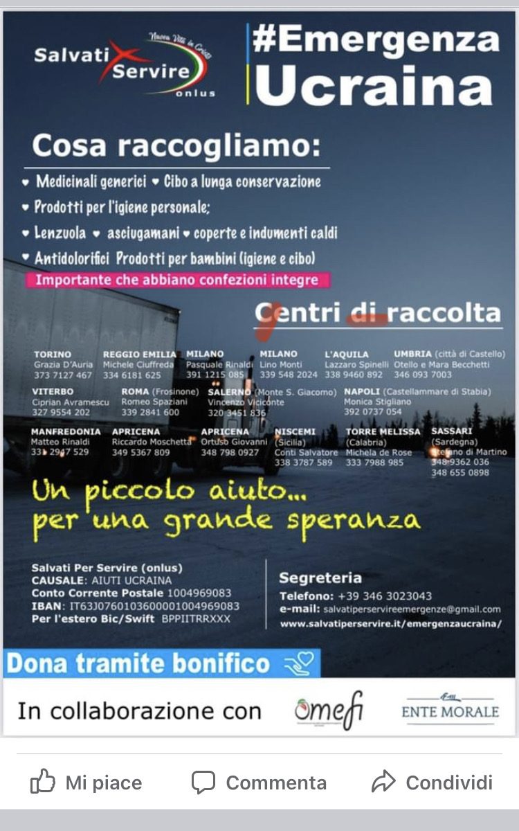 La disumana guerra che è in corso nel cuore dell’Europa, molte sono le associazioni, gli istituti, il terzo settore in genere, ma anche tante famiglie e civili Italiani che cercano in ogni modo di aiutare e sopperire ai bisogni delle migliaia di profughi ucraini. Tra le molte associazioni di volontariato, impegnate nel settore della Protezione Civile, da anni opera “Salvati per Servire”, ed esattamente dal 2012, poco dopo il momento in cui il tremendo terremoto sconvolse la zona dell’Aquila e della intera Italia centrale. Un gruppo di cristiani evangelici, guidati dal fondatore Corrado Camagna, si rese disponibile ad intervenire con operazioni concrete di aiuto umanitario, dirette a limitare i dolori e i disagi di migliaia di persone rimaste senza più nulla al mondo, se non la propria vita. Dal 2012 l’Associazione fa parte anche del circuito nazionale delle associazioni di Protezione civile, a disposizione per interventi in Italia e all’estero in casi di ogni tipo di calamità, o emergenza. L’Associazione ha come valori fondanti quelli della solidarietà e dell’assistenza derivante dai valori cristiani, e ad oggi opera con decine di volontari in diversi ambiti di emergenza, ultimo in ordine di tempo il fronte di guerra in corso in Ucraina, con un punto operativo a Dorohoi, in Romania a poche decine di chilometri dalla frontiera Ucraina del distretto di Černivci. Da lì ogni giorno partono i furgoni carichi di aiuti destinati sia alle persone delle zone di guerra, sia a coloro che ospitano i rifugiati che a decine di migliaia si trovano in quella zona di frontiera, ospiti delle comunità cristiane rumene. Grazie alla solidarietà di tantissime persone, tra cui spicca il punto di raccolta calabrese di Torre Melissa, guidato da Michela Le Rose, è stato possibile inviare nella zona di Dorohoi (Romania) e Černivci (Ucraina), ben 13 tir pieni di ogni genere di aiuti. Vogliamo continuare questa operazione, e a ciascuno diciamo: “aiutaci ad aiutare”, perché molte persone in Ucraina hanno bisogno del nostro aiuto, con la tua donazione loro possono ricevere aiuto come un segno dell’amore e della fedeltà di Dio. Un piccolo aiuto per una grande speranza! Grazie da Salvati per Servire. Forniamo per quanti potranno e vorranno i loro riferimenti.