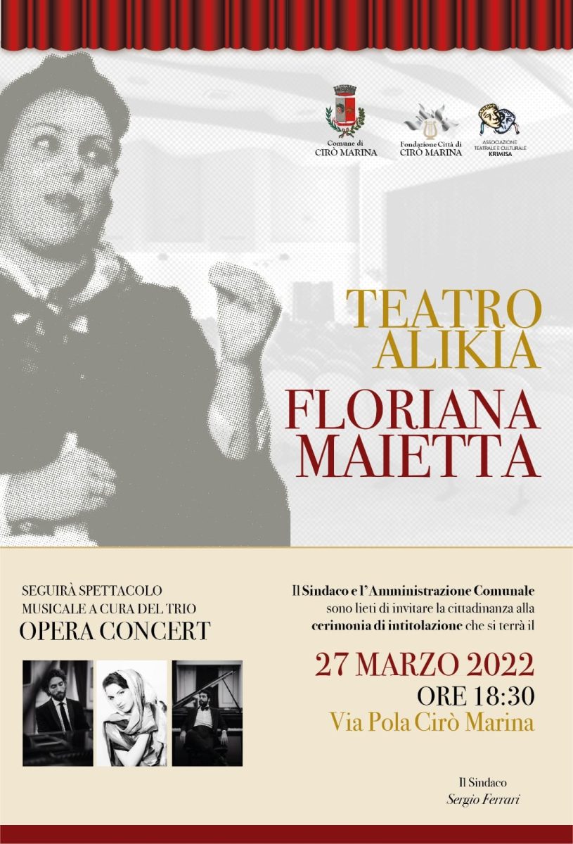 Una serata dedicata alla donna che si è sempre distinta per le sue qualità teatrali e che si è molto spesa per la crescita della cultura teatrale nella nostra comunità” come si legge in una nota diffusa dallo stesso Sindaco, Sergio Ferrari. Una donna che nelle sue tante uscite teatrali e nella vita di ogni giorno, ha dato sfoggio delle sue grandi qualità recitative e umane, regalando sorrisi, coinvolgendo con le sue interpretazioni il sempre numeroso pubblico intervenuto. Una perdita per la comunità, la famiglia, i suoi cari, che ne ricordano l’impegno e la passione per il teatro, la sua seconda casa. A lei, l’amministrazione comunale, abbracciando idealmente il desiderio di tanti, dei suoi genitori e familiari, ha quindi deliberato di dedicare  il Teatro Alikia a Floriana Maietta, che sicuramente, domenica sera vedrà tantissimi concittadini intervenire e partecipare in memoria de Floriana e della cultura teatrale  che ha saputo interpretare e diffondere.