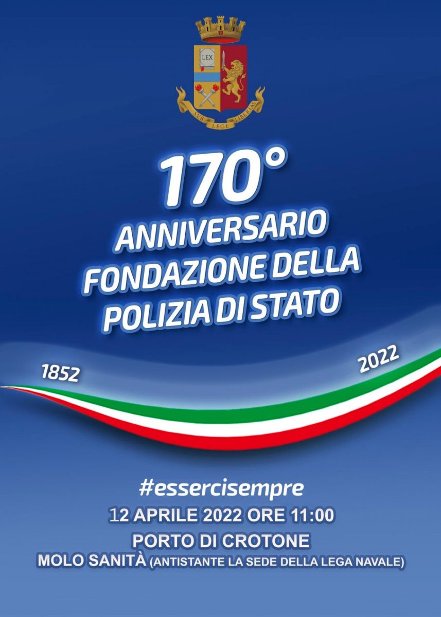 Martedì 12 aprile 2022, la Polizia di Stato celebrerà il 170° Anniversario dalla sua fondazione nel segno del tema “Esserci sempre”.