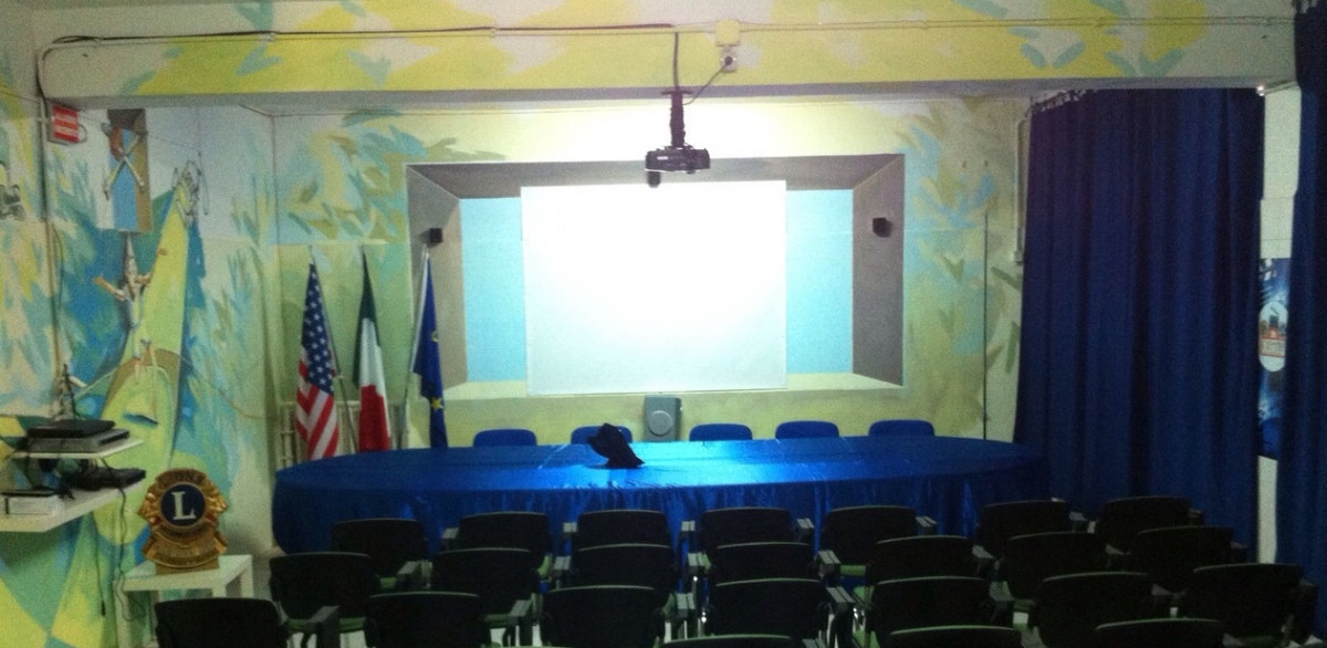 Infine, la sala Cineforum, un autentico gioiello che in origine fungeva da mensa, e consisteva in una sala alquanto grigia e spoglia, ma completamente ridipinta ad opera di artisti locali che hanno contribuito con murales, trompe l’oeil e personaggi dei più famosi cartoons e corredata di una discreta cineteca, un proiettore, uno schermo e 60 poltroncine con bracciolo, tutti acquistati dai Soci, per completare il quadro dell’offerta culturale messa in atto dal Club.