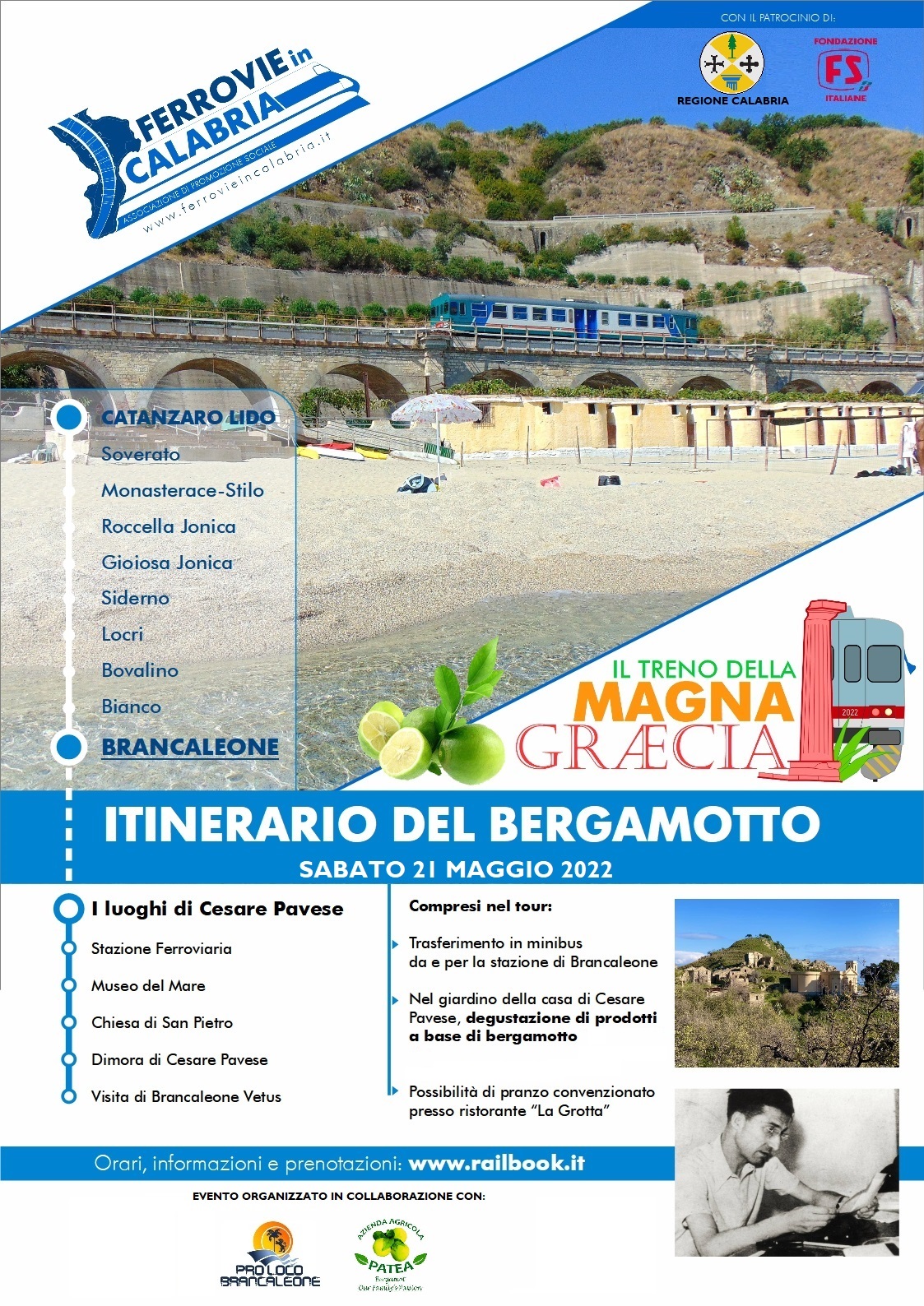 Il 21 maggio 2022, con quella che siamo certi sarà la prima di una lunga serie di iniziative analoghe, partirà quindi da Catanzaro Lido, alla volta di Brancaleone  “Il Treno della Magna Graecia” – Itinerario del Bergamotto. Grazie alla collaborazione della Pro-Loco di Brancaleone, infatti, i viaggiatori potranno trascorrere una indimenticabile giornata alla scoperta di quello che fu il luogo di esilio di Cesare Pavese, visitando i cosiddetti “luoghi pavesiani”, partendo proprio dalla stazione ferroviaria di Brancaleone, passando per la dimora di confino dello scrittore, la chiesa di San Pietro, il Museo del Mare, ed il mozzafiato parco archeologico urbano di Brancaleone Vetus, l’antico insediamento della cittadina jonica, abbandonato in seguito alla pesante alluvione che lo colpì nel 1953. Da alcuni anni, Brancaleone Vetus sta rinascendo come luogo di alta valenza archeologica e sociale, grazie al processo di cura e valorizzazione portato avanti quotidianamente dalla Pro-Loco di Brancaleone e dalla passione del Presidente della stessa, Carmine Verduci, che accompagnerà i viaggiatori de “Il Treno della Magna Graecia” nelle visite di tutti i luoghi citati.