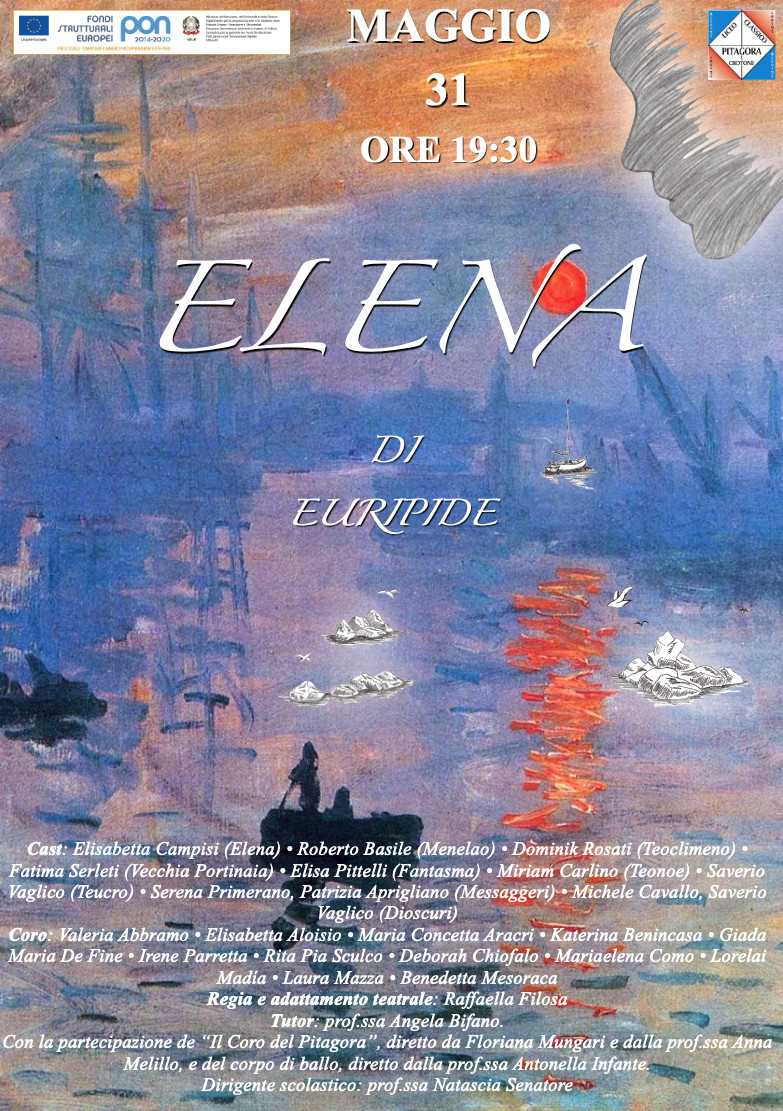 Martedì, 31 maggio, alle ore 19,30, il gruppo teatrale del Liceo Classico “Pitagora” di Crotone metterà in scena l’”Elena” di Euripide, a conclusione dell’attività laboratoriale di quest’anno.