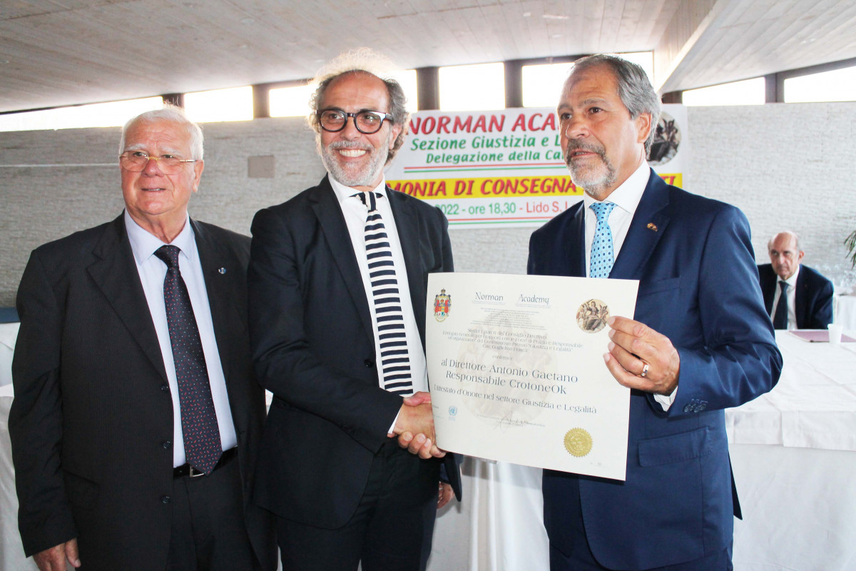 Nella splendida città di Crotone, arriva “Giustizia e Legalità”, la sezione creata dal Cav. Guglielmo Frasca, che da ottobre 2018 all’interno della prestigiosa Accademia, “Norman Academy”, il cui fondatore nazionale e segretario generale, è il Cav. Vincenzo Cortese, che premia coloro che si distinguono nelle varie attività, mirate alla beneficenza, alla sicurezza, all’imprenditoria, ma anche all’arte ed alla cultura, grazie alla collaborazione ed organizzazione del segretario regionale di Giustizia e Legalità, Cav. Giuseppe Crea, per la regione Calabria, ha visto protagonisti personaggi illustri nel panorama ecclesiale, come il nuovo vescovo Don Severino Parisi, ora vescovo di Lamezia Terme, ed a tutto il presbiterato. La manifestazione si è svolta in una splendida cornice, la cattedrale di Crotone, dove una folta platea, ha assistito alla consegna delle prestigiose riconoscenze, il tutto condotto da Serena Gray, moderatrice della giornata, che ha passato la parola poi ai vari personaggi di spicco tra i quali il Proff. Tito Lucrezio Rizzo, giurista, al Vescovo Angelo Panzetta, al Dott. Don Claudio Pirillo, psicologo clinico e religioso ospedaliero. Dopo la consegna degli attestati, una suggestiva riproduzione di immagini sulla santissima Pietà, è stata presentata da Monsignor Timothy Verdon, la giornata di premiazione è continuata poi al ristorante Lido San Leonardo, altra suggestiva location sul mare, dove sono stati conferiti altri riconoscimenti, ad avvocati, autorità locali ed anche al consigliere Fabrizio Meo. In conclusione di serata, ha preso poi la parola il Segretario Nazionale e fondatore della sezione “Giustizia e Legalità”, il Cav. Guglielmo Frasca, per ringraziare e salutare tutti i presenti, dove ha ricordato, con un discorso molto accorato, l’importanza della giustizia e della legalità, in ogni azione compiuta, e di sottolineare come sbagliato sia il pensiero di affiancare la città di Crotone, come una città, priva di valori e di affetti umani. Durante l’evento, prima nella Cattedrale e poi al Lido San Leonardo, sono stati consegnati 65 attestati alle Autorità civili, militari e cittadini. Delle otto Lauree consegnate, ad Honoris Causa, una l’ha ricevuta il Capo dei Clavigeri dei Musei Vaticano Cav. Gianni Crea, che le sarà consegnata a breve nei Musei Vaticani, dal Cav. Giuseppe Crea, Delegato Regionale della Calabria, l’altra al Cav. Giuseppe Diana, nipote dell’eroe Claudio Crea. Al Cav. Giuseppe Crea è stato consegnato l’attestato con nomina di Delegato Regionale della Calabria della Norman Academy, il “Capitolino d’Oro omaggio a Ruggero II” ed un attestato di Sua Santità Papa Francesco, di “Benedizione Apostolica”. Alla memoria dell’eroe Melissese e Crotonese Claudio Crea, è stato conferito uno degli attestati più prestigiosi “Medaglia Aurata”.