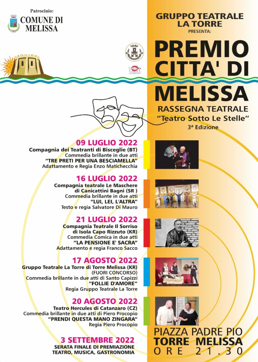 Per il terzo anno consecutivo, la programmazione estiva melissese si arricchisce con la rassegna teatrale “Teatro sotto le stelle – Premio città di Melissa”.