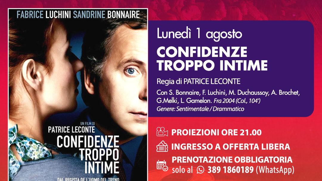 Secondo appuntamento, lunedì 01 agosto, alle ore 21:00, nella splendida cornice della Villa Comunale di Crotone con “Cinalci Estate” la rassegna giunta alla sua V edizione a cura di Cinalci e Compagnia dello Ionio. Il progetto è stato finanziato dalla Calabria Film Commission attraverso l’Avviso pubblico per il sostegno alla realizzazione di festival e rassegne cinematografiche e audiovisive in Calabria 2022”.Lunedì 01 agosto ci sarà la proiezione del film “Confidenze troppo intime” per la regia di Patrice Leoconte. Una commedia sentimentale fuori dagli schemi, con qualche elemento di mistero
