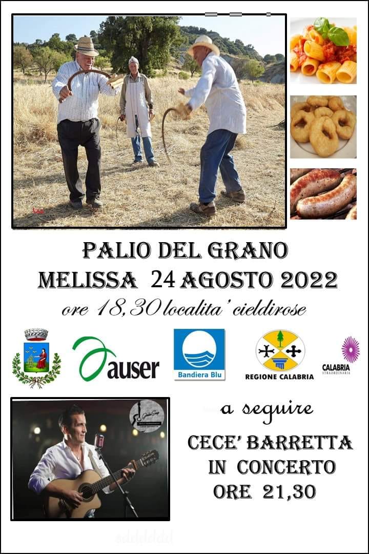 Anche quest’anno melissa rivivrà il palio del grano,giunto alla IV edizione e organizzato dall’AUSER VOLONTARIATO MELISSA in collaborazione col Comune di Melissa L’evento si svolgerà in località cieldirose mercoledi 24agosto 2022 a partire dalle 18,30. La mietitura che ridiventa festa della memoria è quello che si prefigge l’auser volontariato Melissa. Anziani contadini, donne e bambini tornano nei campi a mietere il grano con le falci secondo le vecchie tradizioni dei braccianti calabresi. E proprio questo evento rappresenta per noi melissesi un tornare indietro al 1949, anno in cui ci fu l’eccidio di Melissa proprio perché i contadini di Melissa affamati avevano invaso i terreni incolti del barone Berlingeri per coltivarli e per produrre quel grano che simboleggiava la vita e il poter sfamare i propri figli. Una festa che vuole unire le diverse generazioni. La prima fase dell’evento vedrà la benedizione del grano sul fondo cieldirose dove si porteranno tanti contadini vestiti in abiti anni 50 muniti di falci taglienti.