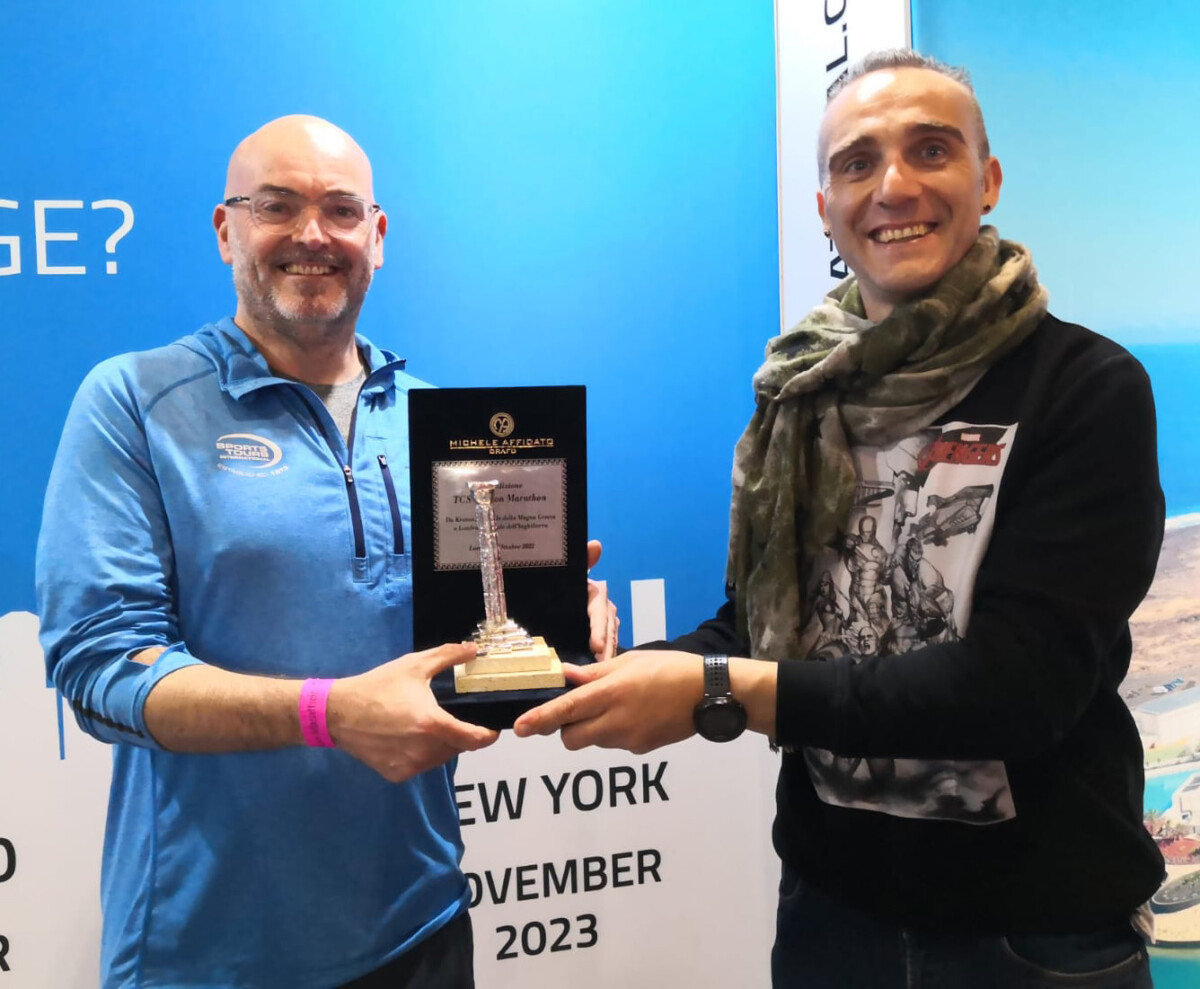 Si è svolta lo scorso 2 ottobre la 42^ edizione della TCS London Marathon, che ha visto partecipare più di 50.000 atleti provenienti da tutto il mondo, che si sono cimentati in un percorso che è partito da Blackheat per terminare a Saint James Park. Tra questi, ha gareggiato, anche l’atleta crotonese Alfredo Argirò, che ha completato la sua 20^ maratona proprio sul suolo britannico, che ha condotto una gara perfetta per quasi tutta la lunghezza dell’estenuante maratona. A sostenere il podista crotonese, arrivato alla sua quarta manifestazione delle Major Six Marathon, è stato ancora una volta Michele Affidato. Il maestro orafo, da anni partner sportivo, affianca il runner nelle sue imprese: nel 2017 alla New York City Marathon, nel 2018 alla Chicago Marathon e nel 2019 alla Rotterdam Marathon. Alfredo Argirò, tesserato con la società piemontese del Gruppo Sportivo Interforze Torino e appartenente al Corpo della Guardia di Finanza, assieme ad Affidato da anni porta avanti un progetto che fonde assieme sport, cultura e legalità in varie parti del mondo. Nello specifico, il corridore pitagorico, ha potuto omaggiare il responsabile della Sport Tour International di Londra, Paul O’Halloran, di un dono che racchiude la cultura e la storia di una città intera: la “Colonna d’Argento” del maestro orafo Michele Affidato. La scultura è stata consegnata nel corso di un incontro organizzato presso l’expo della maratona, dove rimarrà per sempre esposta nella sede dello Sport International Tour di Londra insieme ad altri importanti premi sportivi. La Colonna di Capocolonna è il più antico e conosciuto simbolo di Crotone, unica superstite del tempio dedicato dagli antichi greci a Hera Lacinia. La sua forma è stata ripresa da Affidato, che ne ha fatto un simbolo di identità, per raccontare, attraverso la sua arte orafa, la storia e la cultura di un intero territorio. Esportare il nome di Crotone e della Calabria intera, in Italia e all’estero, è oramai una vera e propria mission per Michele Affidato, che da sempre lavora per far emergere le bellezze di un intero territorio. La scultura, poi, nel corso degli anni è stata consegnata a tantissimi artisti italiani ed internazionali. “Realizzare la Colonna di Capo Colonna – commenta Affidato – è per me sempre motivo di orgoglio, perché mi dà la possibilità di far conoscere sempre di più la mia terra. Sono entusiasta per la prestazione sportiva di Alfredo, che da sempre si impegna per mantenere alto il nome di tutta la sua città, portandola in giro per il mondo – ha poi aggiunto il maestro orafo – Questo connubio tra sport, arte orafa, legalità e cultura funziona particolarmente bene perché, permette in maniera molto semplice di lanciare messaggi positivi”. Il commento di Argiro’:”nel momento in cui ho consegnato la Colonna di Capolonna all’expo village di Londra, erano presenti molti atleti, è partito un lungo applauso e non nascondo che oltre alla forte emozione provata, mi sono sentito fiero ed orgoglioso di rappresentare la mia città”.