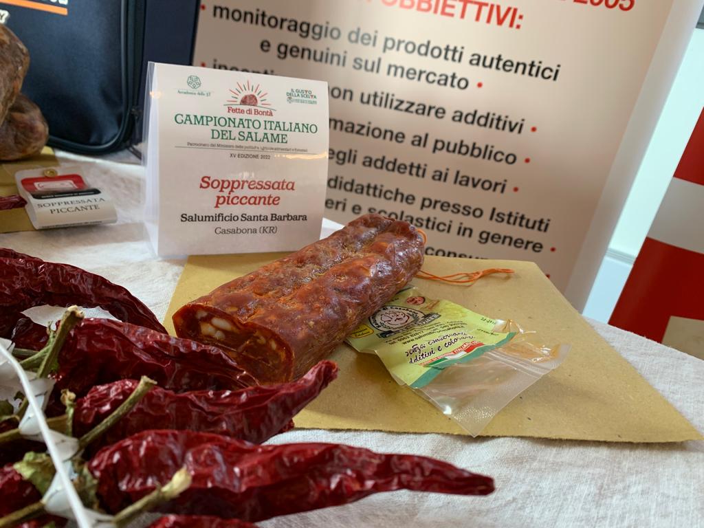 E’ la sopressata piccante di Camillo Palmieri titolare del salumificio di Casabona “Santa Barbara” il salame più buono d’Italia, è quanto decretato dalle Giurie composte da esperti, giornalisti, nutrizionisti, ricercatori universitari, operatori del settore che hanno assaggiato e valutato i salumi giunti in finale al Campionato Italiano del Salame 2022 organizzato dall’Accademia 5 T, che si è svolto nei giorni 8 e 9 ottobre a Sasso Marconi (BO). Per Natale Carvello Presidente del Gal Kroton questa vittoria rappresenta la rivincita dei nostri saperi e sapori e delle nostre tradizioni, una vittoria del gusto e della pregiata salumeria calabrese in cui si è messo generazioni di passione e dedizione e tutta l’arte e l’amore verso la realizzazione di questi capolavori. Per le Giurie le caratteristiche dei salumi del Salumificio di Casabona sono quelle di “un prodotto buono, naturale e sano; in grado di sensibilizzare al rispetto dei valori della memoria per quanto riguarda un cibo:il salame – che ha sempre avuto un ruolo educativo e di incentivo alla convivialità”. La soppressata piccante è un prodotto profondamente radicato nel suo territorio di origine e viene realizzato con l’utilizzo delle parti più nobili del maiale, I soli ingredienti che vengono aggiunti alla carne tagliata, sono il peperoncino locale piccante, il finocchietto e il sale, usato per la conservazione dell’insaccato. Estremamente felice e gioioso di portare la Calabria in alto, ad una cronaca positiva, di speranza e di rinascita – è stato il primo commento di Camillo – contentissimo di aver dato un prezioso contributo e dedica questa vittoria alla Calabria laboriosa.