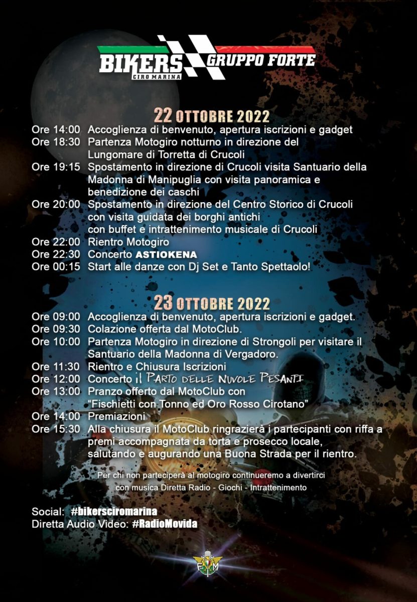 Domenica si riprenderà dopo una lauta colazione, sempre offerta dagl moto clubs, con un’escursione nella vicina Strongoli con visita al santuario della Madonna di Vergadoro e poi, rientrati, musica con il PARTO DELLE NUOVOLE PESANTI e a seguire, pranzo, offerto come la cena precedente dagli organizzatori, musica, riffa, premiazioni e saluti. Molti momenti di puro divertimento, riservato anche ai più piccoli che contribuiranno a rendere questa due giorni avvolti da un’atmosfera magica. Come dicevamo in apertura, il ricavato, come in tutte le altre occasioni che li hanno visti donare a vari Istituti scolastici, defibrillatori, pacchi natalizi per bambini e altro, sarà destinato all’acquisto di una incubatrice per il reparto pediatrico dell’ospedale S.Giovanni di Dio di Crotone.
