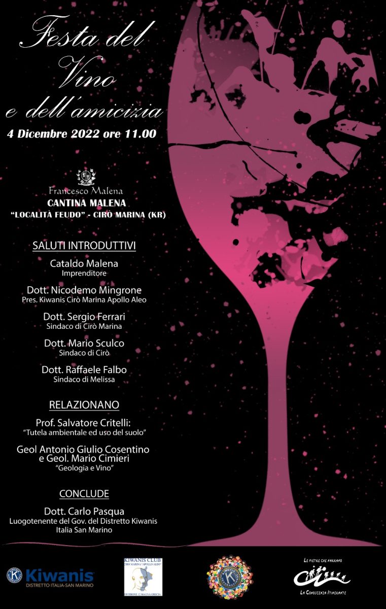 Il 4 dicembre presso la cantina Francesco Malena si è svolta la “Festa del vino e dell’amicizia “ del Kiwanis club Ciro Marina “Apollo Aleo”. Il consueto appuntamento ,che si ripete ormai da tre anni, é stato ,come sempre, occasione per l’effettuazione di una raccolta fondi per la realizzazione di opere in favore dei bambini. Quest’anno la raccolta fondi ha visto come obiettivo l’acquisto di un dispositivo per il servizio di logopedia del sub-distretto ASP di Cirò Marina. La bellissima giornata si è aperta con un convegno dal tema “tutela ambientale ed uso del suolo” tenuto dal professor Salvatore Critelli e “geologia e vino” tenuto dai geologi Giulio Cosentino e Mario Cimieri. Nel corso del convegno sono intervenuti a dare il benvenuto: il socio Cataldo Malena, proprietario della Cantina che ha ospitato l’evento ed il presidente del club Nicodemo Mingrone, il quale ha consegnato anche la targa di socio esemplare all’avv. Roberto Falvo per il continuo apporto all’interno dell’associazione. Sono intervenuti anche il vicesindaco di Cirò Marina Piero Mercuri ed il vicesindaco di Ciró Fortunato Strumbo I lavori sono stati conclusi dal tesoriere distrettuale Giuseppe D’Urso. La giornata ha visto la partecipazioni dei Club di : Corigliano ,con il presidente Giovanni Mastrangelo, che ha omaggiato il club con le clementine di Calabria, di Palmi ,con Emanuele Saccà ed il club di Vibo Valentia con la pres. Teresa Pugliese ed il Past luogotenente Basilio Valente.Al termine del convegno vi è stata una graditissima conviviale, offerta dalla Cantina Malena, dove si sono potuti degustare i vini della prestigiosa cantina ed i piatti tipici della tradizione cirotana seguiti da tarantelle e festeggiamenti.