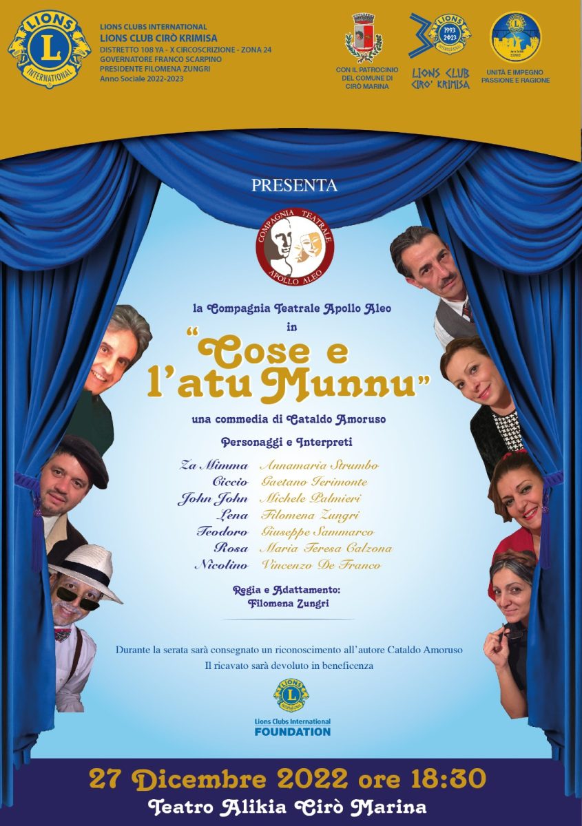 Vi aspettiamo a teatro, martedì 27 dicembre, alle ore 18:30, scrive in una nota la nuova presidente del Lions Club Cirò Krimisa Filomena Zungri- per trascorrere qualche ora all’insegna del buonumore con una delle sue commedie, “Cose e l’atu munnu”, portata in scena dalla Compagnia teatrale Apollo Aleo della regista Zungri. L’artista e scrittore Cataldo Amoruso, sposato con la famosa pittrice Berenice Russo, ha scritto numerosi libri, tante commedie ma anche autore di canzoni. A 13 anni incominciò a studiare il violino col padre Angelo, bravo musicista e buon suonatore di mandolino e fisarmonica. A 20 anni partì per Roma per studiare la chitarra con il maestro Chierici. Nel I962 insieme a Giampiero Scalamogna detto (Gepy e Gepy), produttore artistico di Ornella Vanoni, fondarono un complesso e debuttarono alla Rupe Tarpea, che era uno dei migliori locali dell’epoca. Amoruso accompagnò, con i vari complessi musicali, in cui ha militato, cantanti come, Sergio Endrigo, Luigi Tenco, Piero Focaccia, Mario Perrone ed altri. Fece un concerto di chitarra nel 1962 al teatro Brancaccio di Roma dove il conduttore era Pippo Baudo. Corrado presentò una sua canzone “Lolita” al festival di Pozzuoli qualificandosi al terzo posto. Nel 1965 fondò il complesso “I Ciros” che divenne il più famoso complesso musicale della Calabria, con il disco “Un giorno triste” composto dallo stesso Amoruso. Farà parte dello stesso gruppo anche il cantante cirotano Gino Colicchio per cui Amoruso scrisse due capolavori: “Sono un uomo che ama” e “Stefania” con cui Colicchio sbalzò alle vette delle classifiche italiane. Nel 1966-67-i Ciros accompagnarono alla manifestazione,” La Rampa”, cantanti come Aurelio Fierro Gimmi Fontana, Riccardo del Turco, Tony Astarita. Nel 1968-69 I Ciros sbarcarono a Roma ospiti del “Maxsm’s” all’epoca gestito da Angelo Capoano. Nel 1999 il suo romanzo “Il Conte di Melissa” diventa un film diretto da Maurizio Anania. Amoruso è autore di numerosi libri apprezzati da: Pupi Avati, Mario Monicelli, Antonio Piromalli, Leonida Repaci, Luigi Comencini, Gianni Raviele, Mario Foglietti, Donatella Cuomo, Paolo Cinanni, Cesare Mulè, Antonio Cerminara, Anselmo Terminelli, Nelly Brisinda, Antonio Floccari, Agostino Formica, Isabella Lo Schiavo, Dante Maffia, Dario Bellezza, Giuseppe selvaggi, Nicola Vaccaro. Ci attende dunque una serata teatrale culturale i cui proventi dei biglietti saranno devoluti in beneficenza.