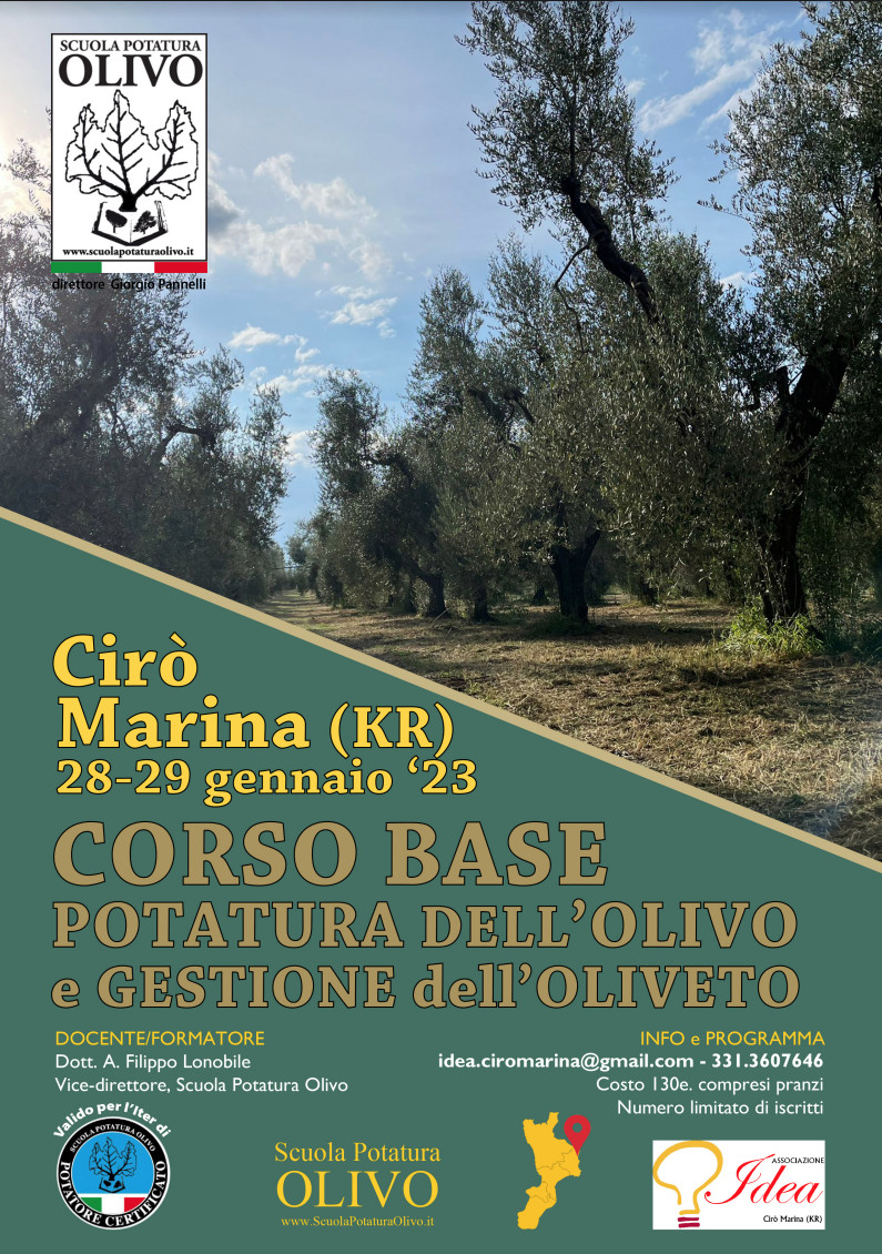 Primo evento per la provincia di Crotone, direttamente dalla “Scuola potatura olivo” diretta da Giorgio Pannelli, un corso base di Potatura dell’olivo da terra e Gestione dell’Oliveto, che si terrà a Cirò Marina nei giorni 28 – 29 gen prossimi. Un corso teorico e pratico rivolto all’hobbista che intende gestire gli olivi, capire come trattarli, a chi affidarli ma anche al professionista esperto che desidera aggiornarsi sulle tecniche moderne e approfondire le sue conoscenze “sull’Albero-Olivo”. Si ripasseranno i suoi principali aspetti anatomici e fisiologici per capire quali integrazioni sono convenienti per mantenere sano il nostro territorio preservandolo dalle avversità e rispettandone la biodiversità. Verrà posta particolare attenzione sugli strumenti da utilizzare per la potatura, la sicurezza sui luoghi di lavoro e sull’uso dei dispositivi da utilizzare durante la potatura. Verranno potate piante di ogni età (anche grandi secolari del Sud) e tipologia stando attenti a zone vegetative e produttive. Particolare attenzione verrà posta alle varietà locali, alle problematiche dovute al riscaldamento globale e al ruolo fondamentale del Potatore Certificato. Al termine del corso verrà rilasciato l’Attestato di Partecipazione valido per l’iter formativo di “Potatore Certificato della Scuola Potatura Olivo”.
