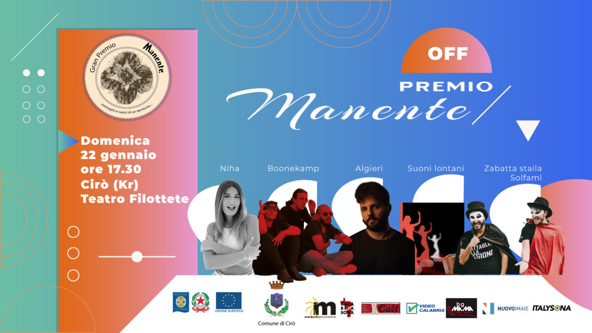 Chiamata a condurre l’evento, che andrà in onda successivamente in prima serata sul canale 10 di Video Calabria, è Sarah Memmola, “voce” nota al grande pubblico grazie alle sue tante partecipazioni televisive Nazionali ed Internazionali. Il Gran Premio Manente “OFF” è realizzato dall’Associazione Cult, Calabria Sona, Marasco Comunicazione in collaborazione con il Comune di Cirò, Video Calabria, il Nuovo Imaie e la Rete Italiana World Music.
