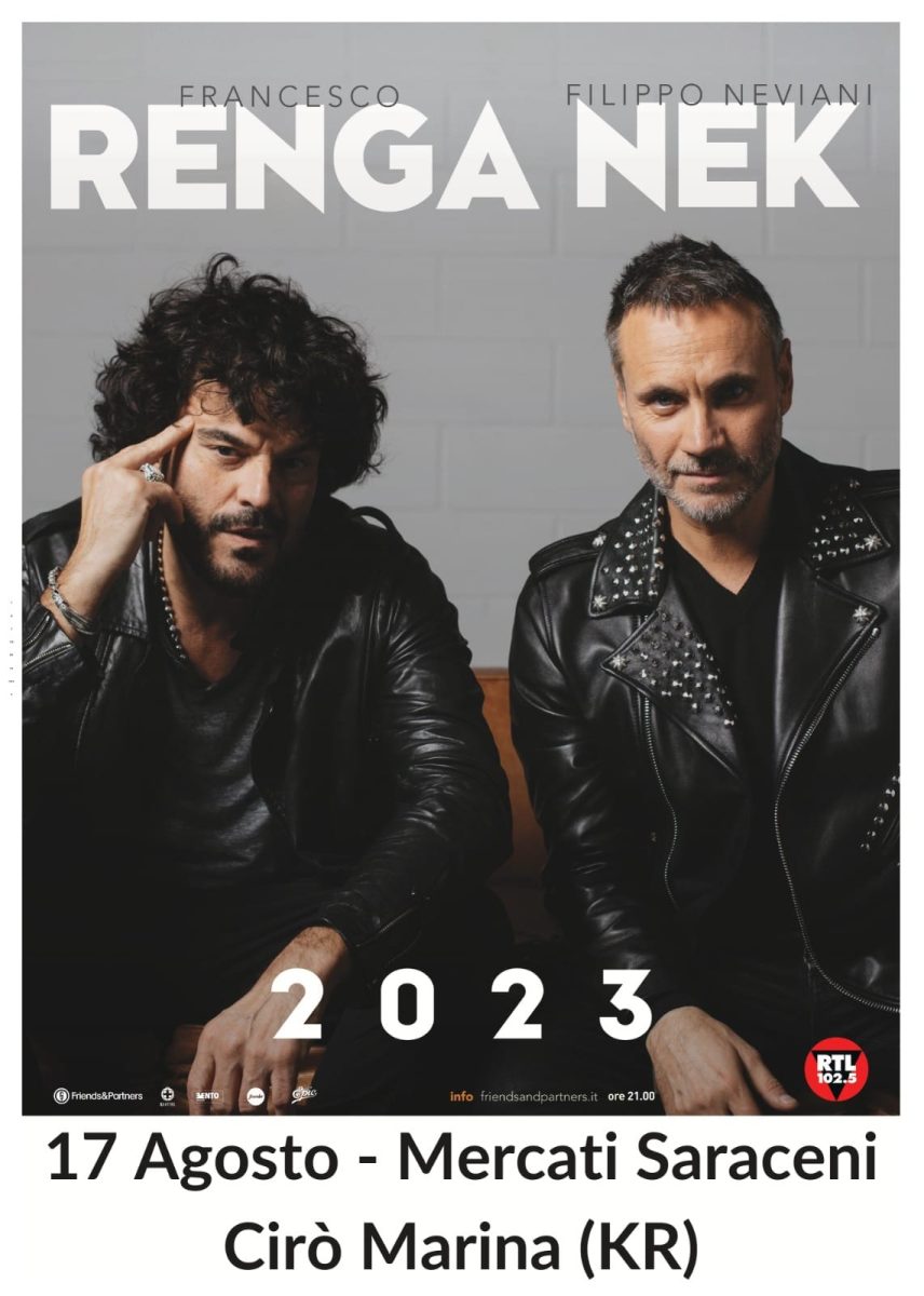 Il prossimo 17 agosto, ai Mercati Saraceni di Cirò Marina, avremo il piacere di ospitare un concerto imperdibile, con due grandi artisti della musica italiana: 𝗙𝗿𝗮𝗻𝗰𝗲𝘀𝗰𝗼 𝗥𝗲𝗻𝗴𝗮 e 𝗡𝗲𝗸!!